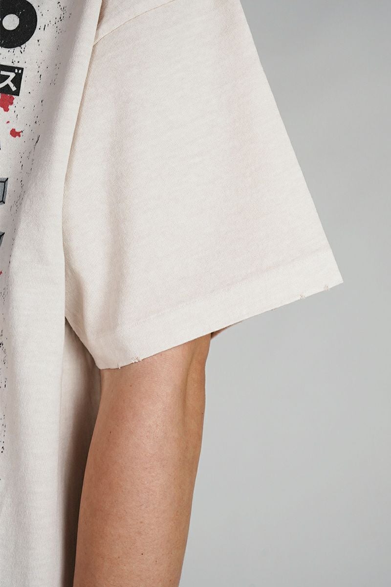 グラフィックデザインと同様に、ヴィンテージのバンドTシャツの雰囲気を高度な加工技術で表現。