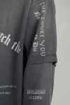 映画のワンシーンや哲学的なメッセージ、様々なフォントがTシャツ全体を埋め尽くす、まるでアートをまとうようなデザイン。