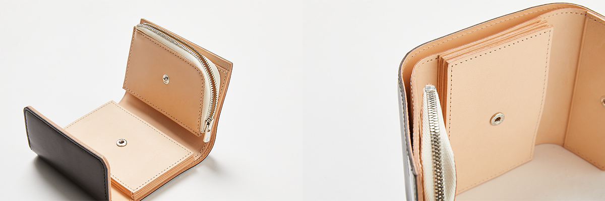 スナップボタンで開閉する仕様で容量は札入れが1箇所、ジップ式の小銭入れが1箇所、カード入れが3箇所、ポケットが1箇所となります。