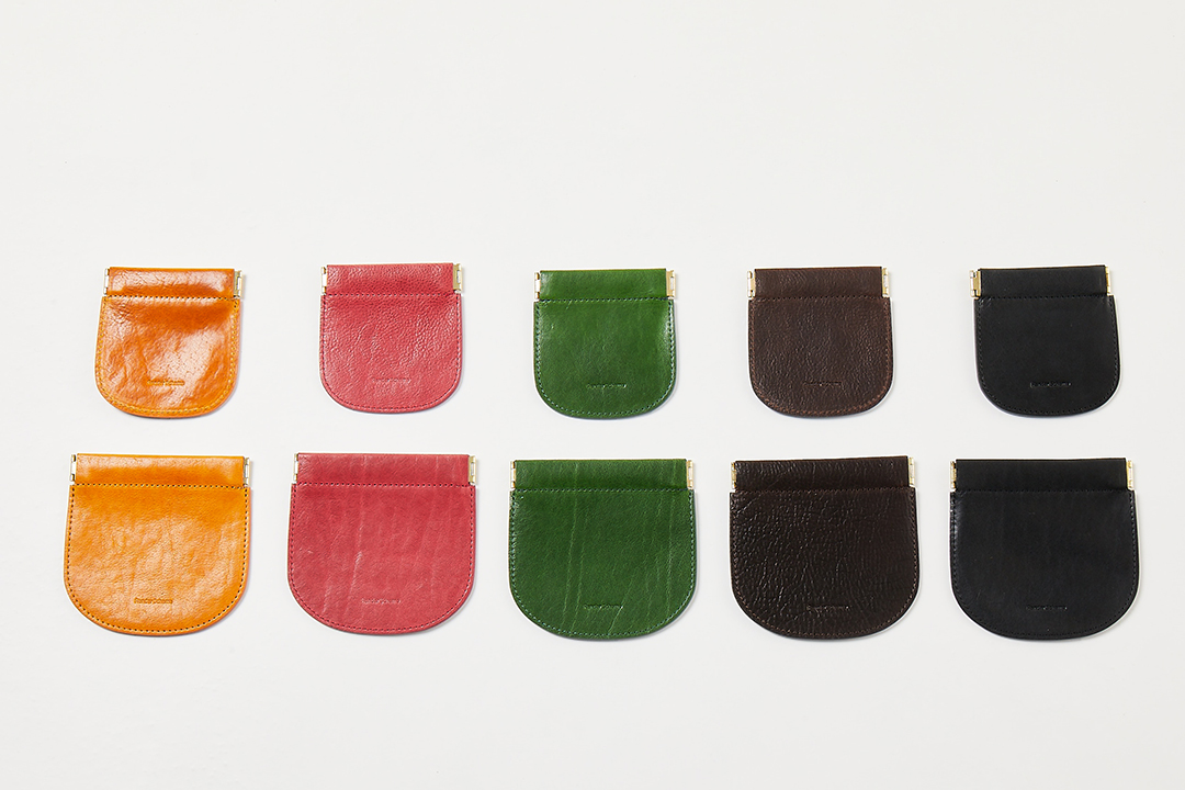 革は、ヌメ下地に染料で色を付けた丘染の革で、グレージング加工により自然な品のある艶感の牛革を使用したコインケース。