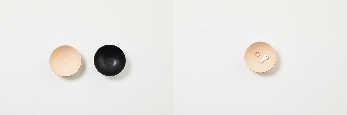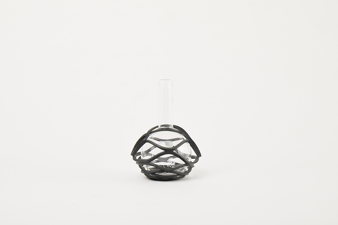 フラスコやシャーレなどのガラス器具とベジタブルタンニンレザーが組み合わさることで、実験用の道具は花器やオブジェという新たな道具に化け、使用されるシーンは実験室から居室などの生活空間に移ります。