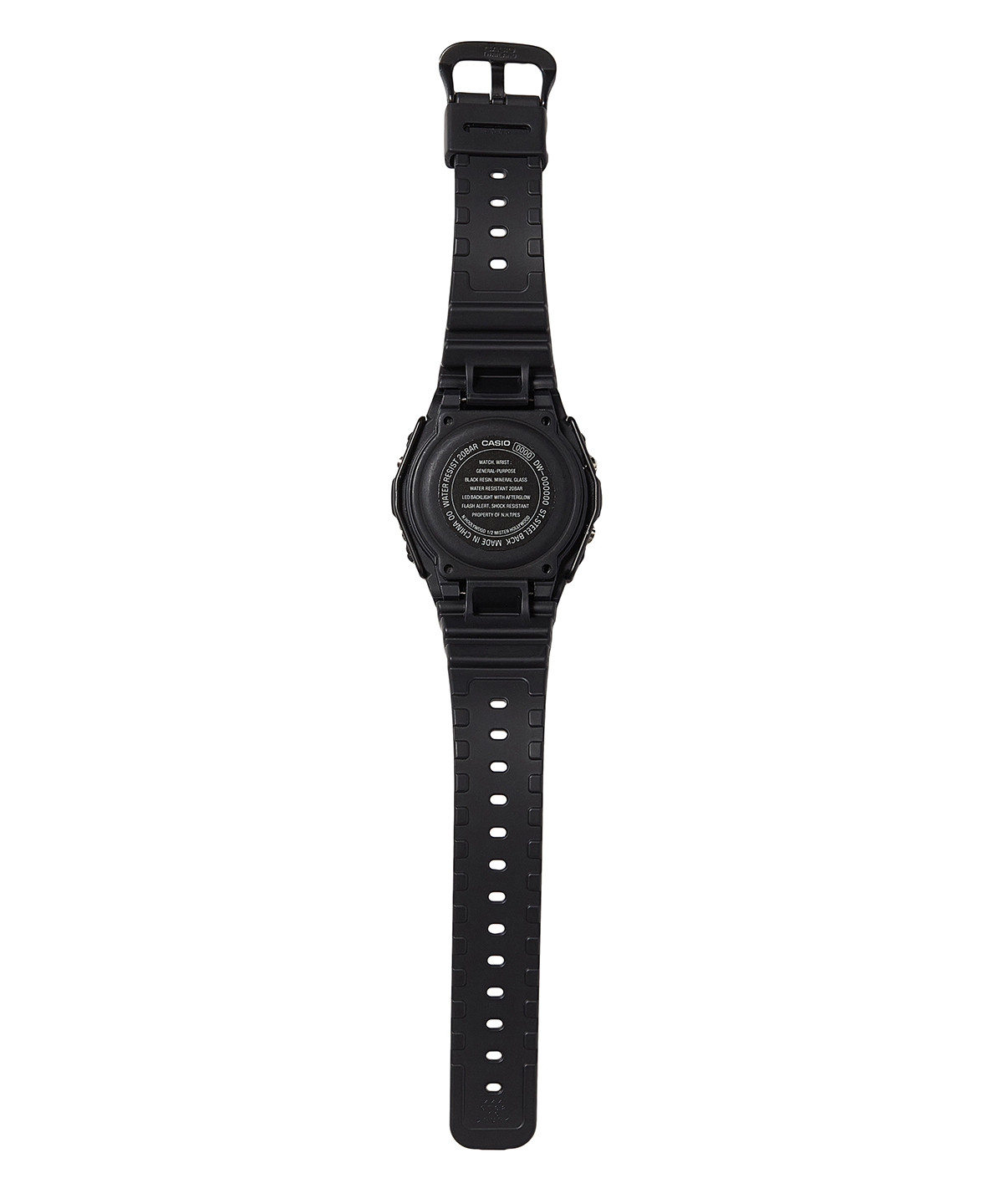 今季はG-SHOCK初期の丸型モデルである”DW-5700”をベースモデルに初採用。1987年に登場し、日本国内では未発売ながらも世界的に人気を博したDW-5700の特徴的なディテールを踏襲し、オールブラックで完成したストイックな一本。