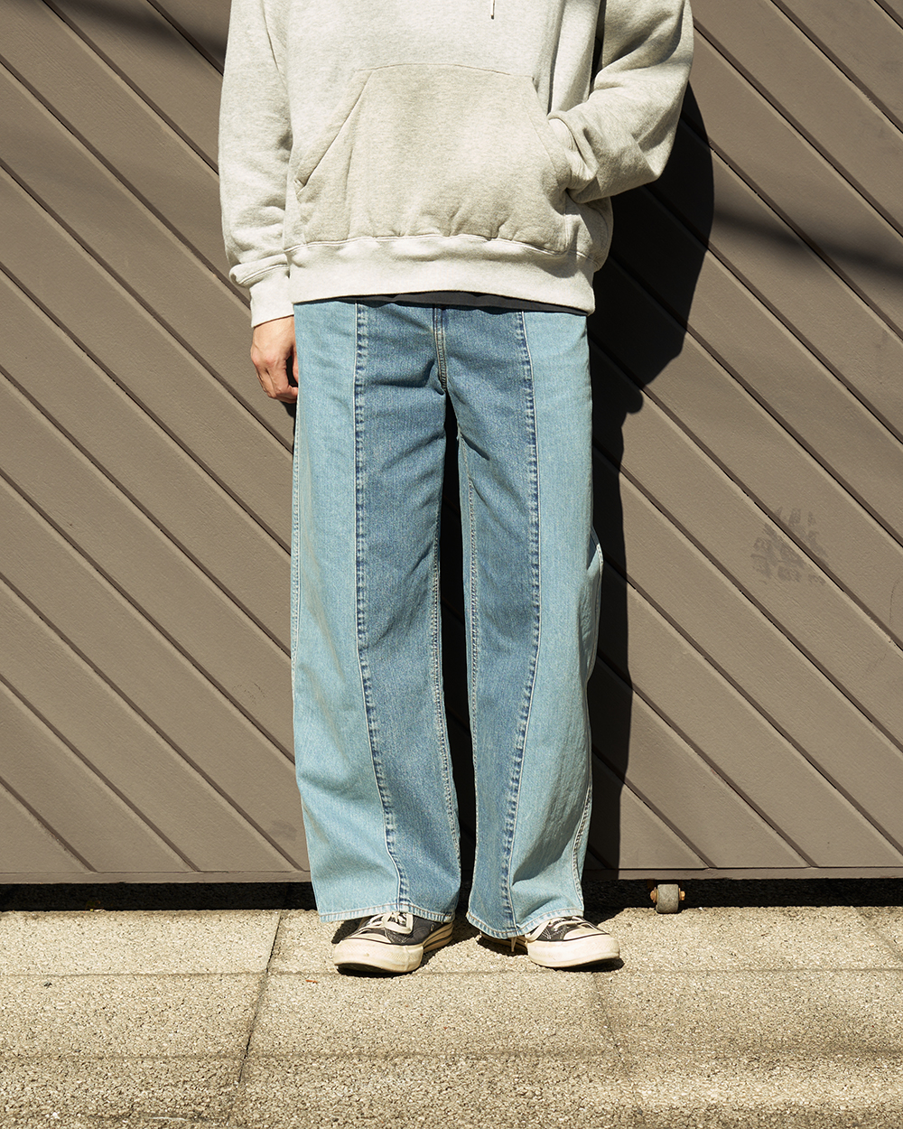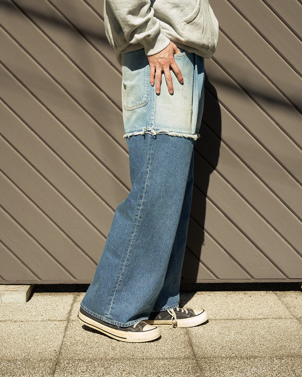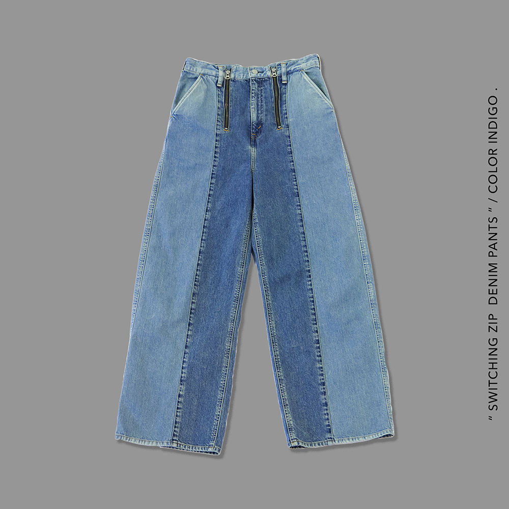 フロントジップにスイッチングデニムデザインを施した、ワイドストレートデニムパンツ。