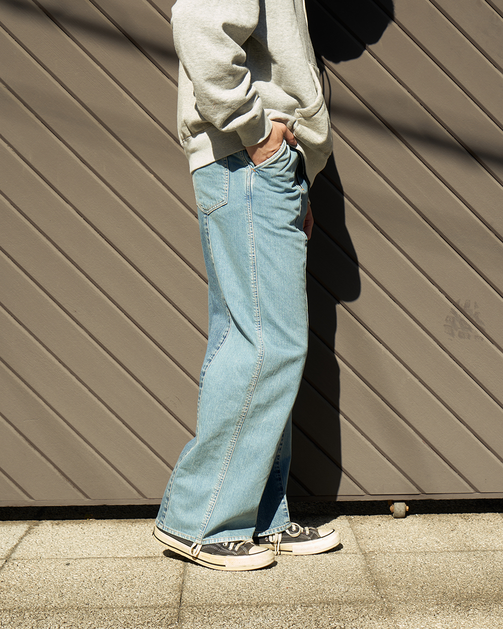 ミニマルなデザインながらも、シルエットにこだわったルーズフィットデニムに、岡山の加工場で職人の手で細部までこだわりvintageの風合いを表現したアイテムに。