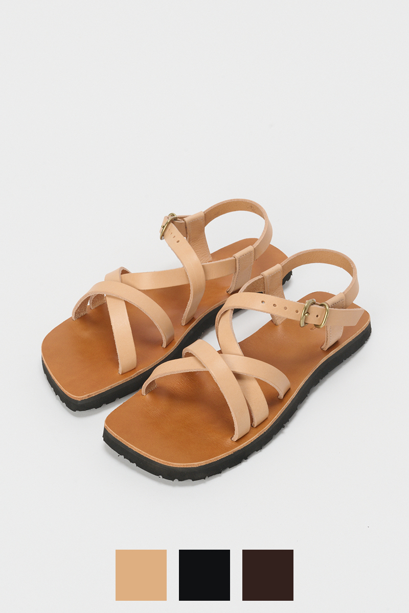ベジタブルタンニンレザーの力強さと、華奢なストラップのコントラストが目を引く一足。