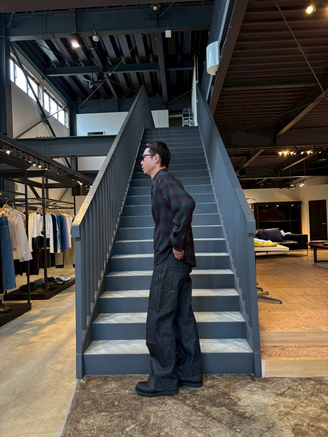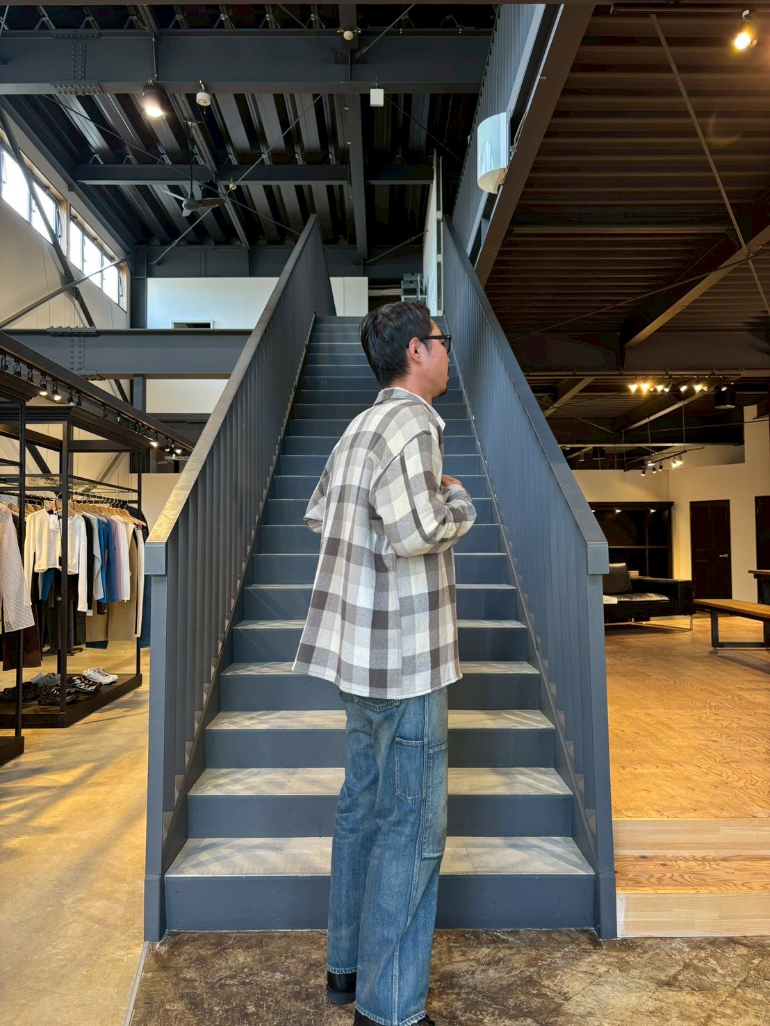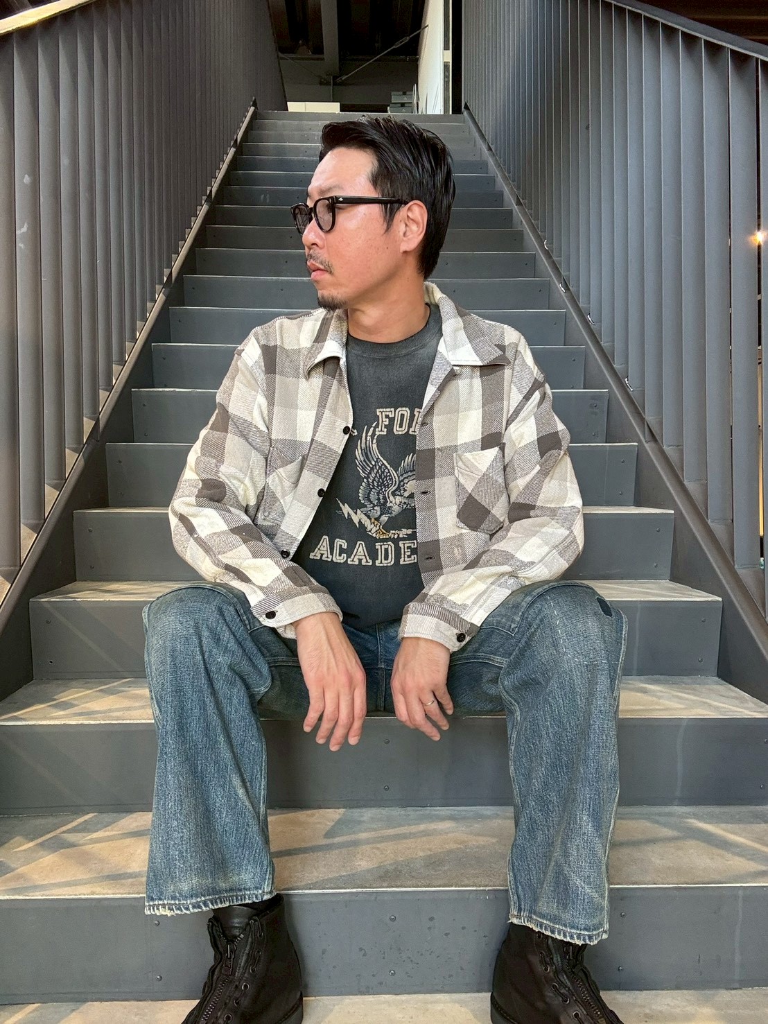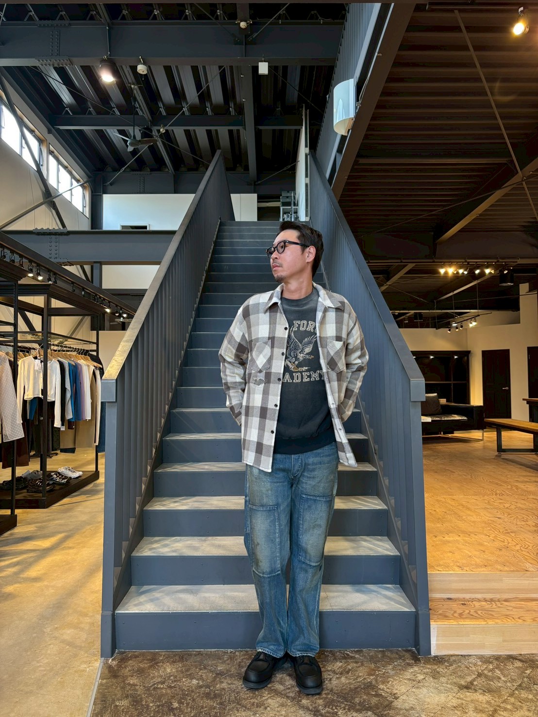 デニム、ネルシャツ、スウェット、ワークブーツの革靴など。