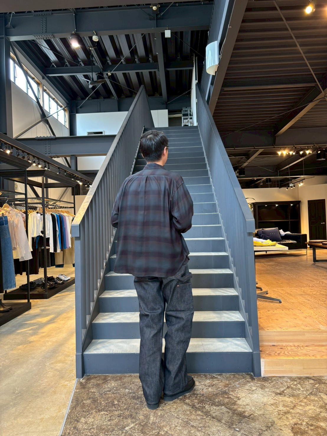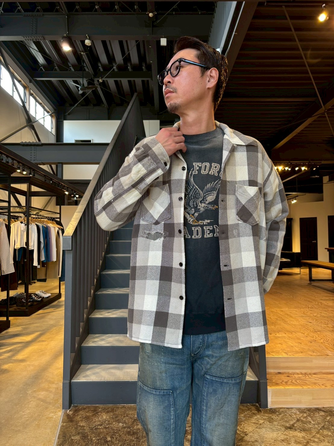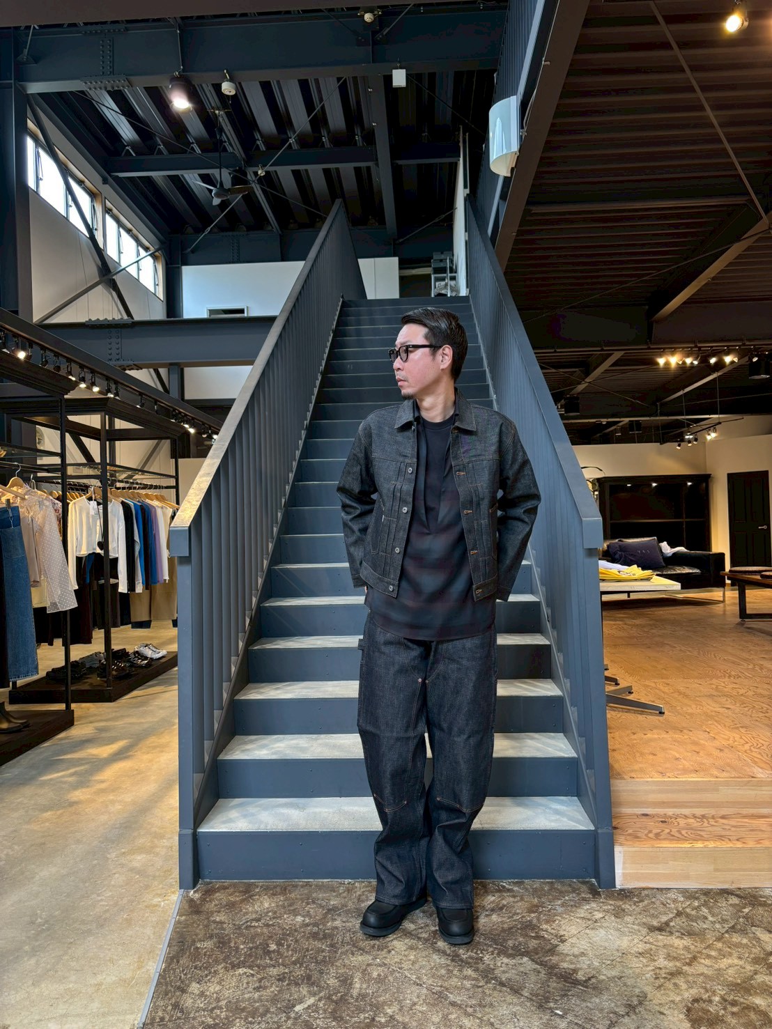 デニム、ネルシャツ、スウェット、ワークブーツの革靴など。