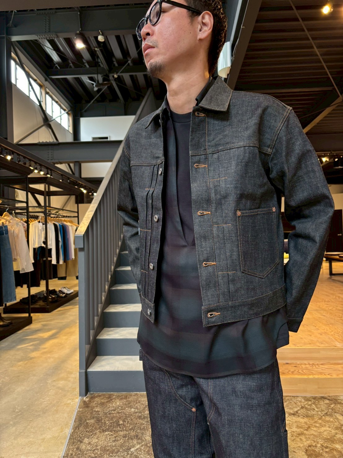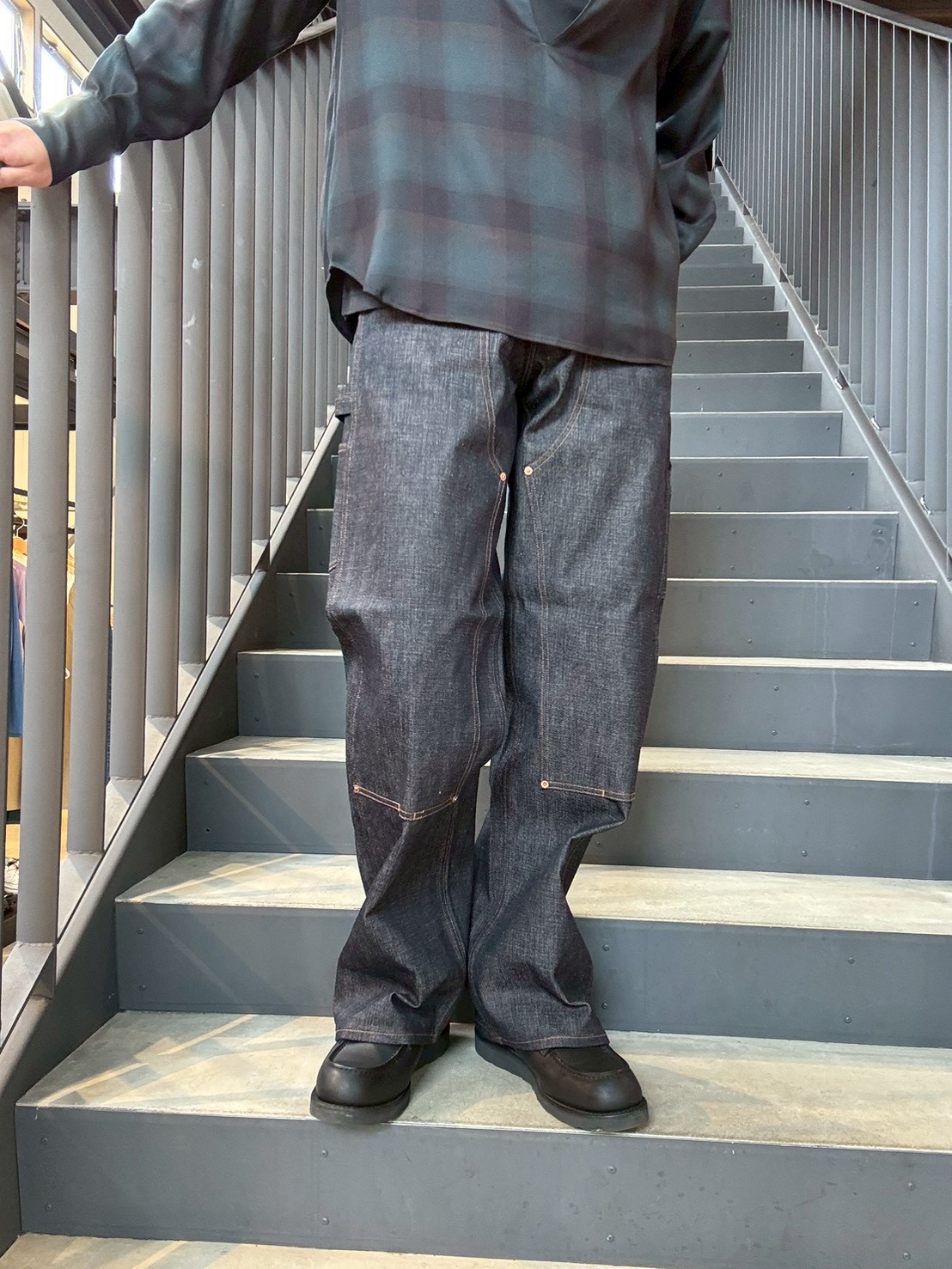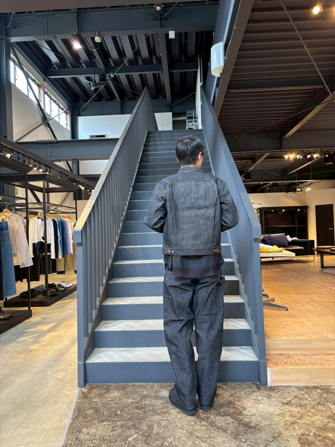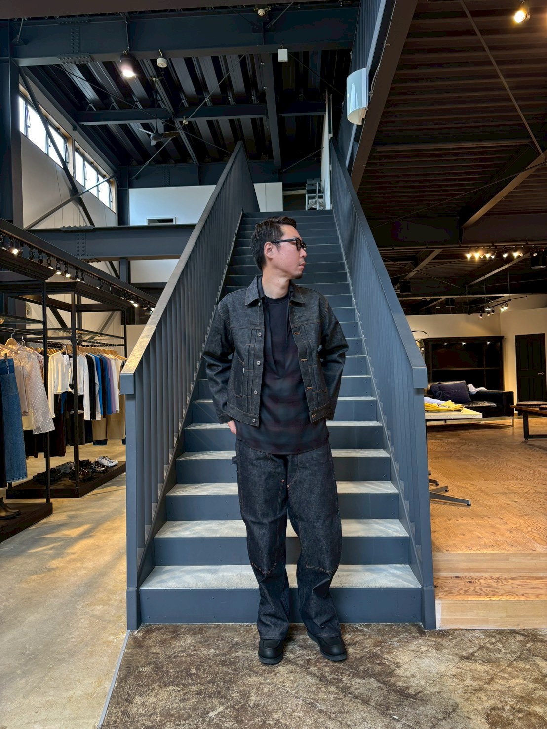 デニム、ネルシャツ、スウェット、ワークブーツの革靴など。