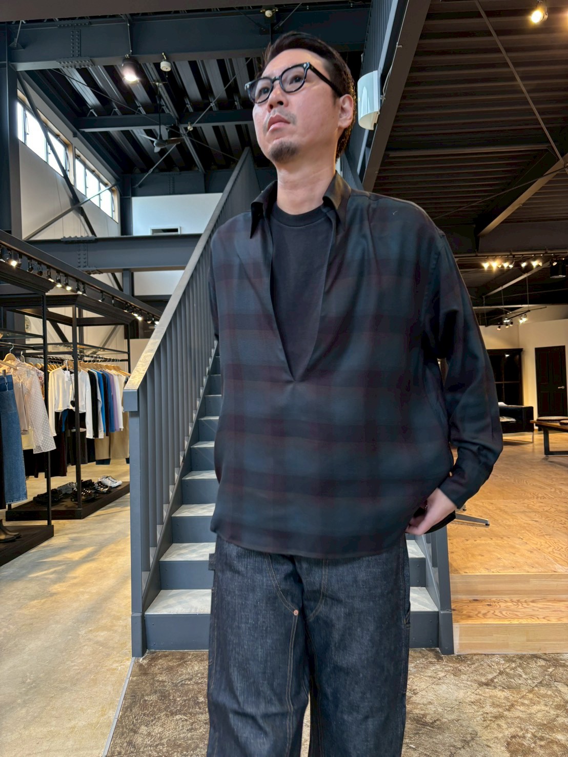Tシャツ+ネルシャツの重ね着で奥行き感を演出。