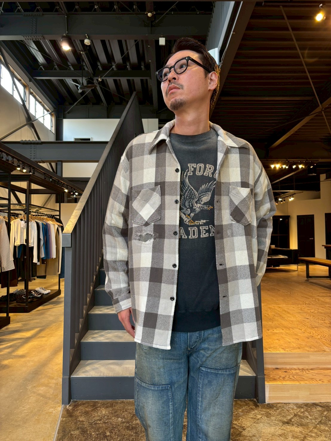 二つ目はスウェット+ネルシャツにデニムとワークブーツのスタイリングです。
