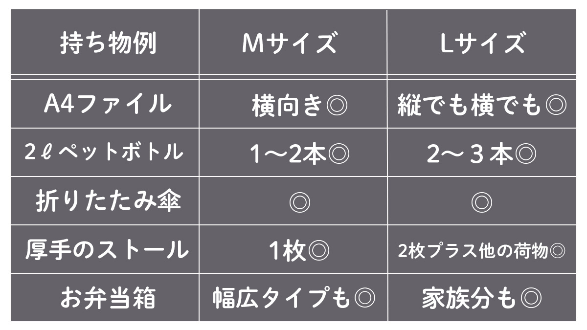 1. 【比較表】Mサイズ・Lサイズで入るもの一覧