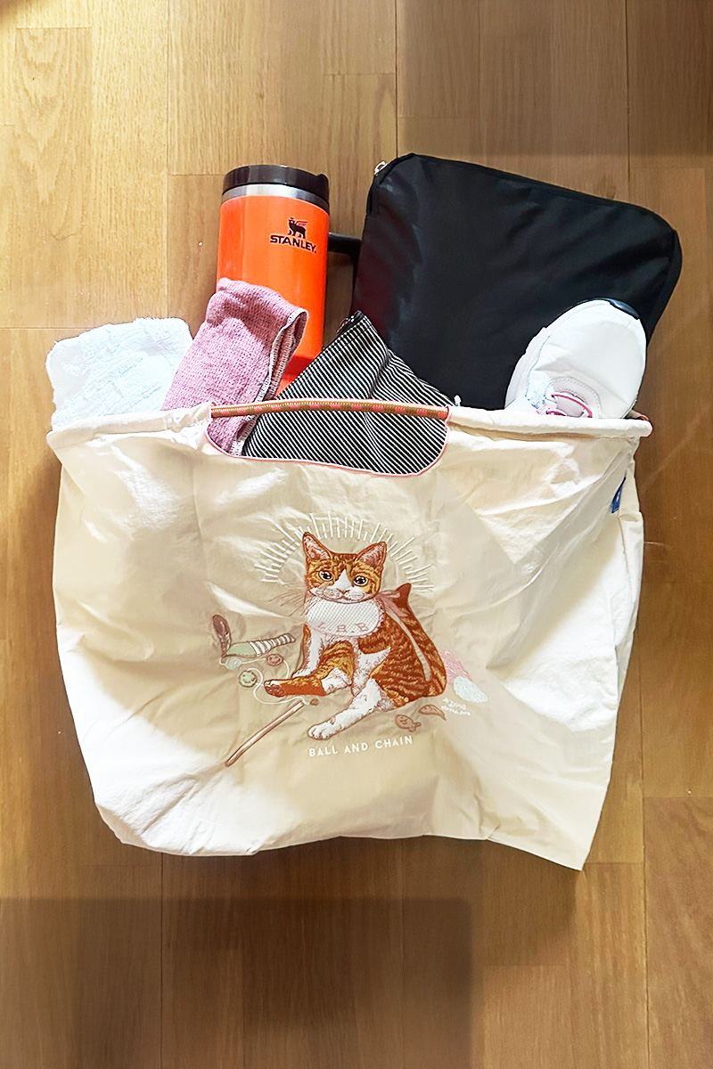 ジムに行くときセットで、普段ならリュックを背負っていく量なので、これが丸ごと入るのはビックリ。バッグ自体が軽いので、重いものも入れられます。持ち手のコードを絞ると肩掛けにもしやすくなることと、滑りにくいのも嬉しいポイントだと思いました!