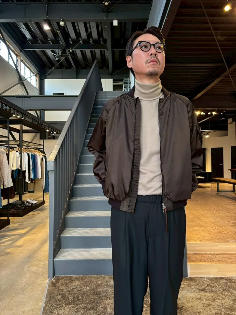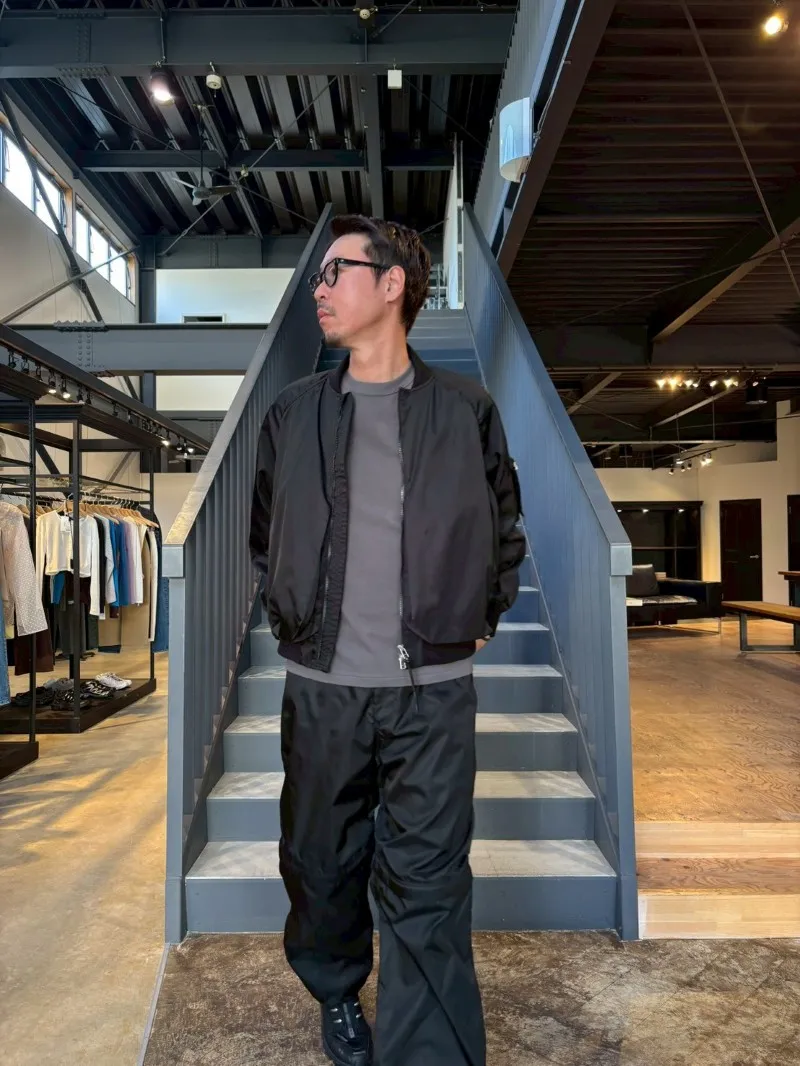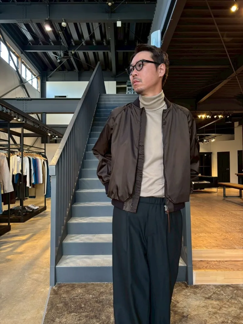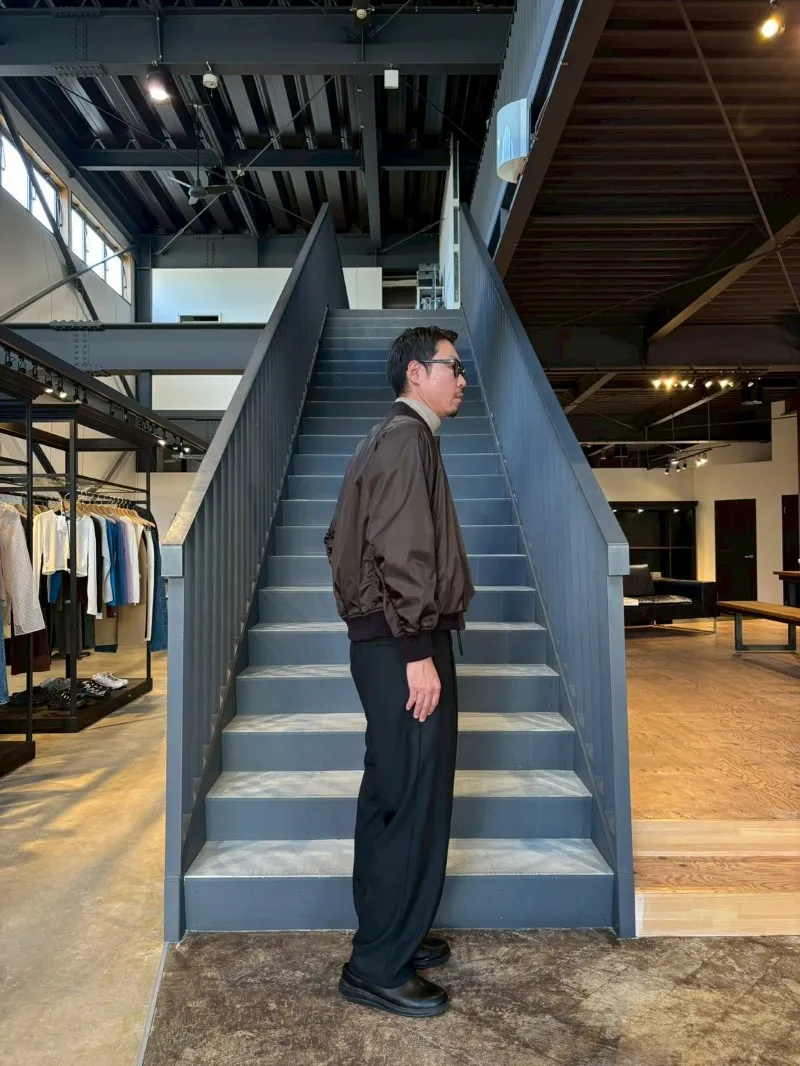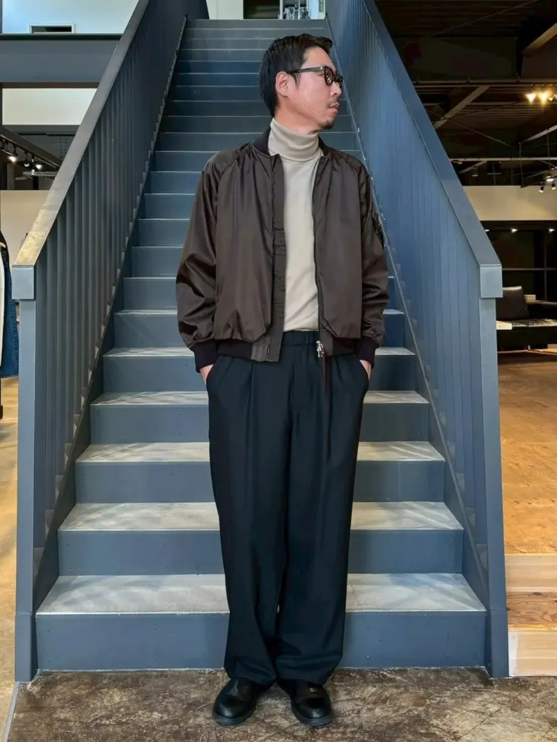 ボンバージャケットはもともと “ショート丈” なので、高身長の方には “脚長を活かしつつ上半身にも程よいボリューム” を作る上で非常に使いやすいアウターです。