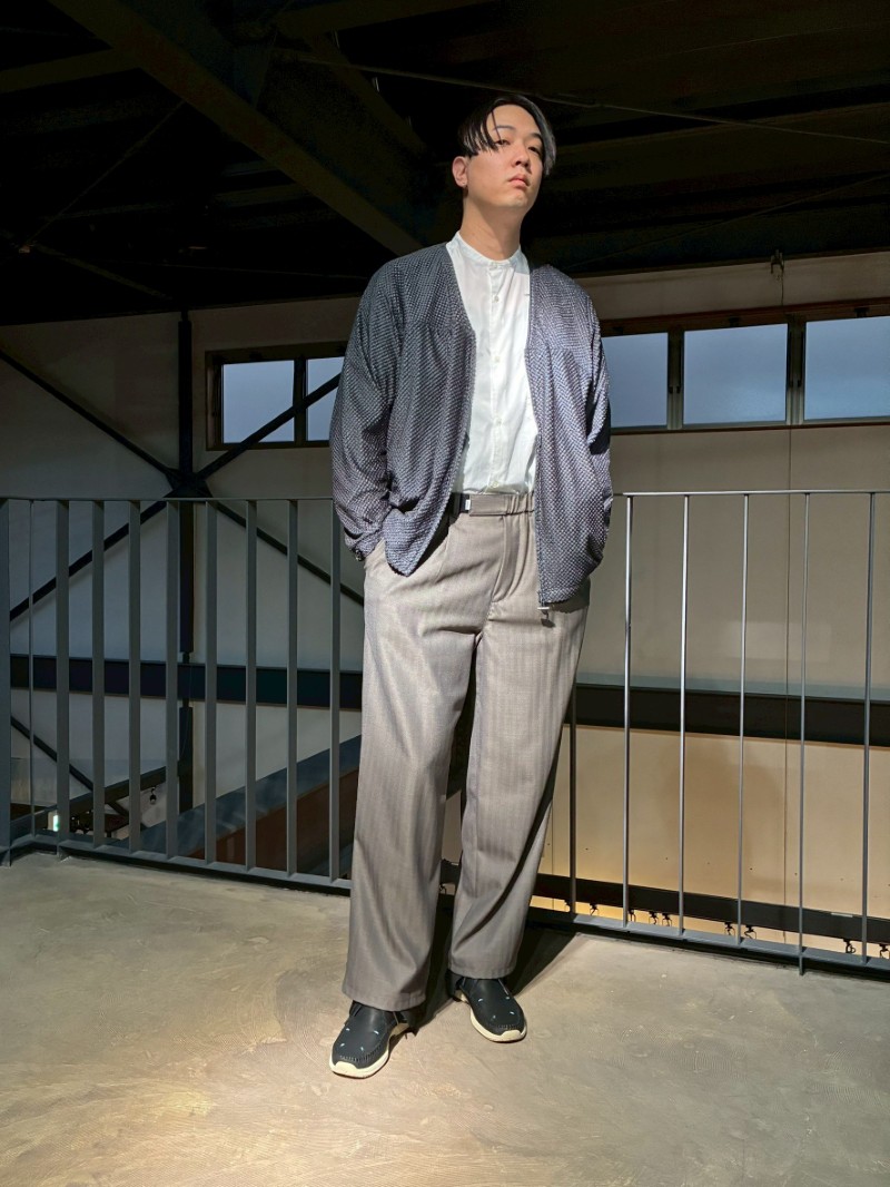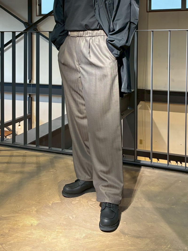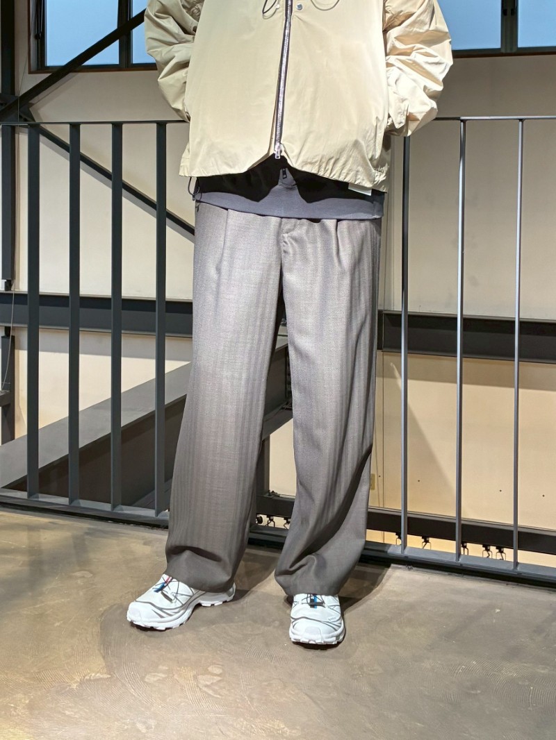 Graphpaper(グラフペーパー)の「メランジヘリンボーンストライプ シェフタックパンツ」について、実際に穿いた感想や高身長ならではの着こなし方を紹介します。