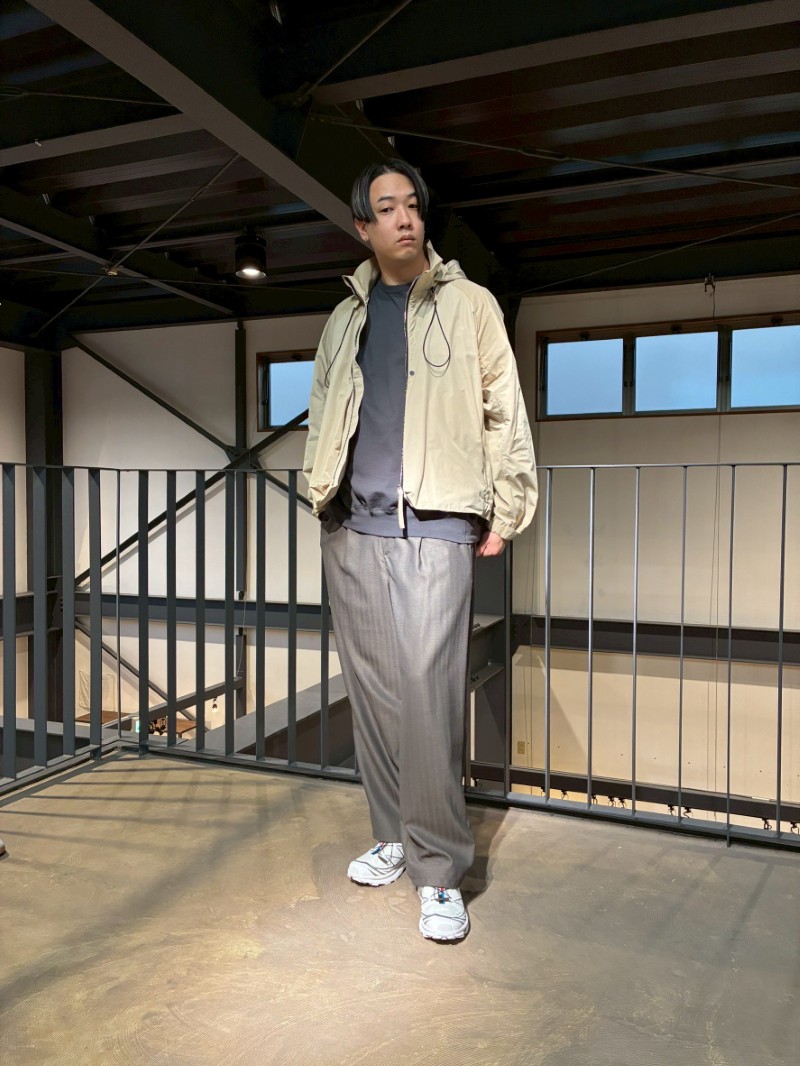 パンツの上品な雰囲気に、ストリートの要素を足してミックス。