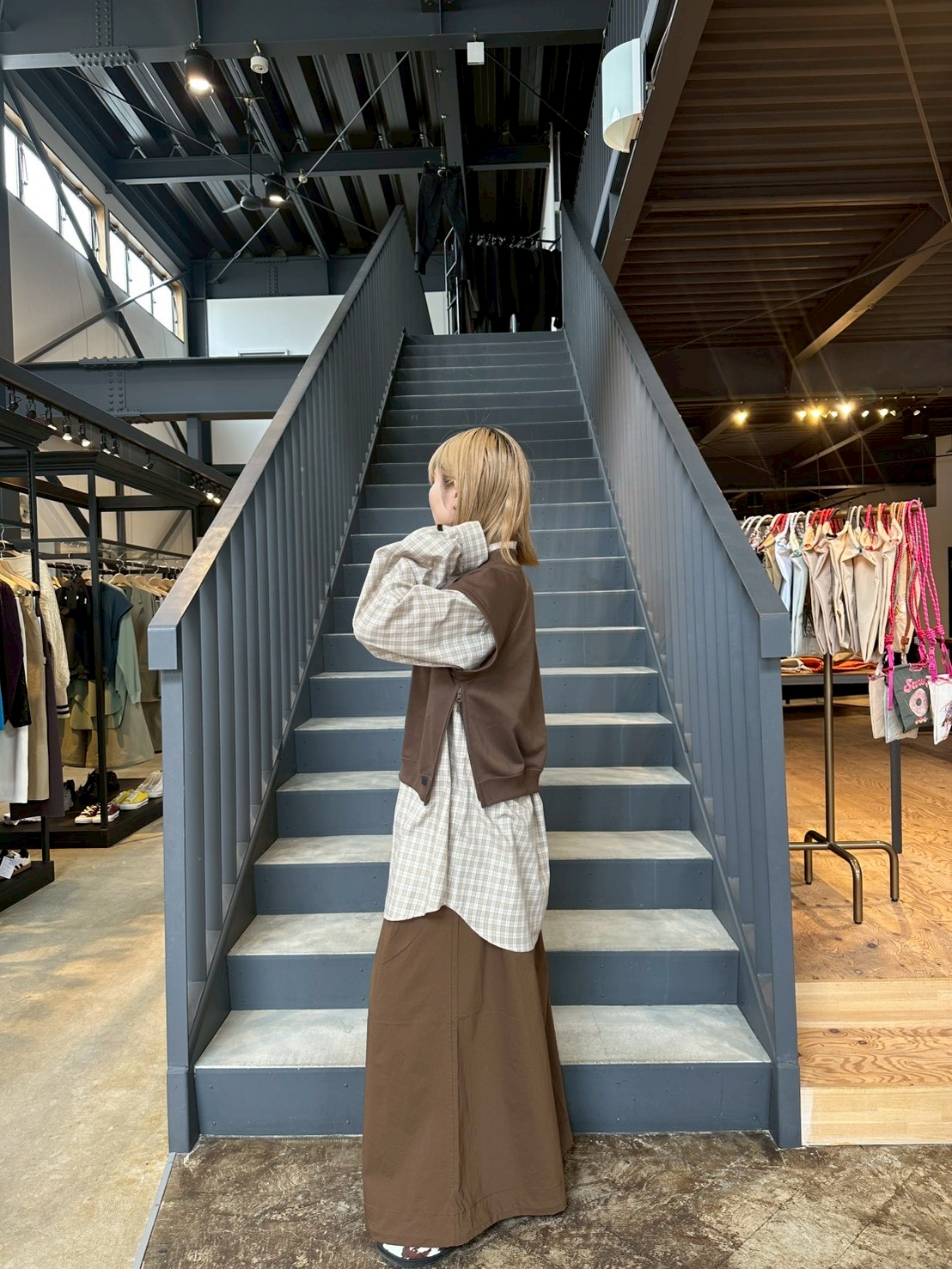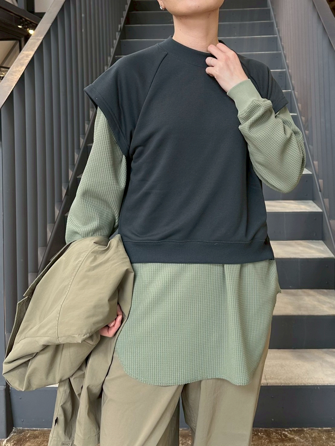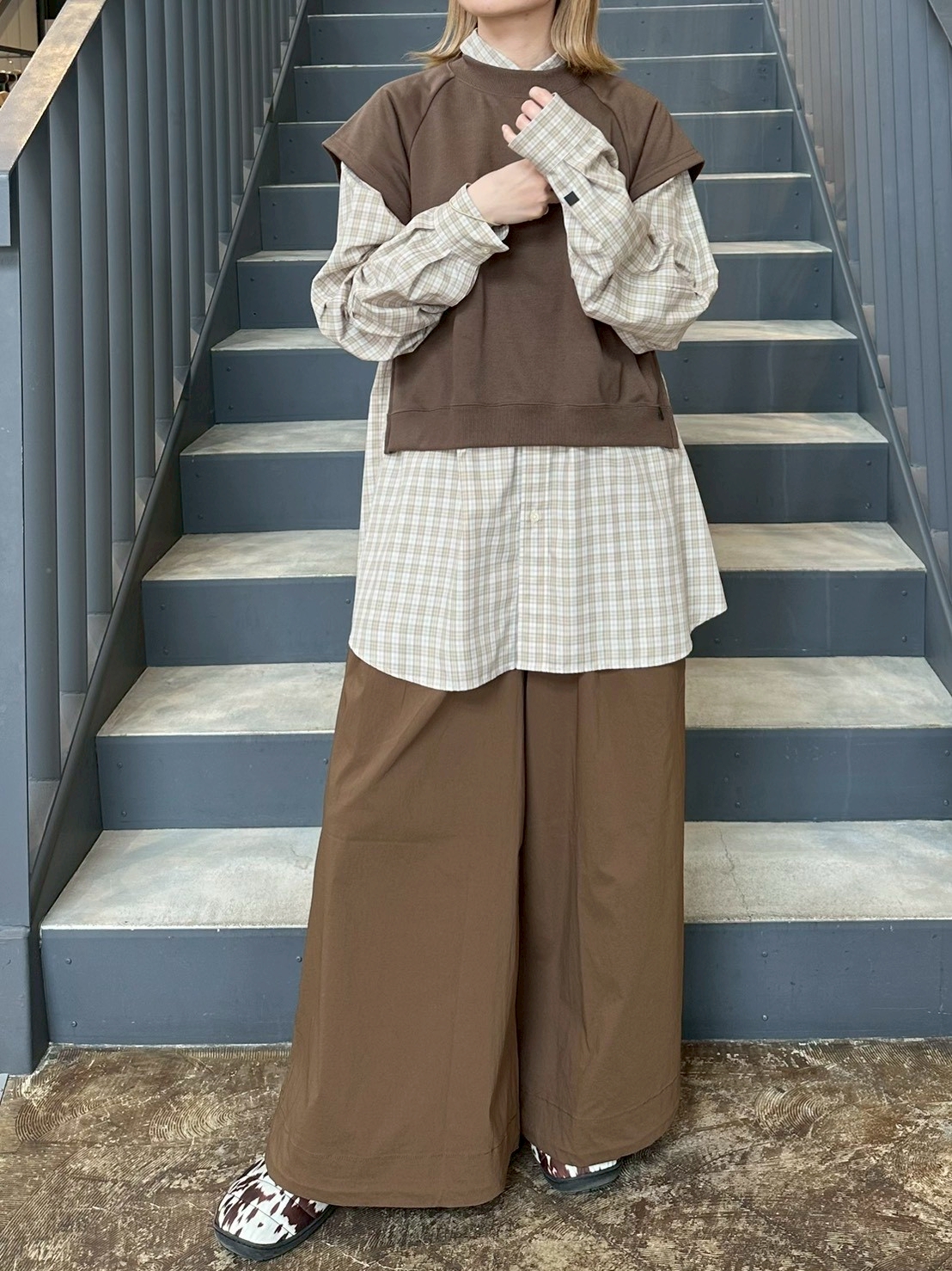 シャツ+ベストを重ねるだけで雰囲気が変わります。