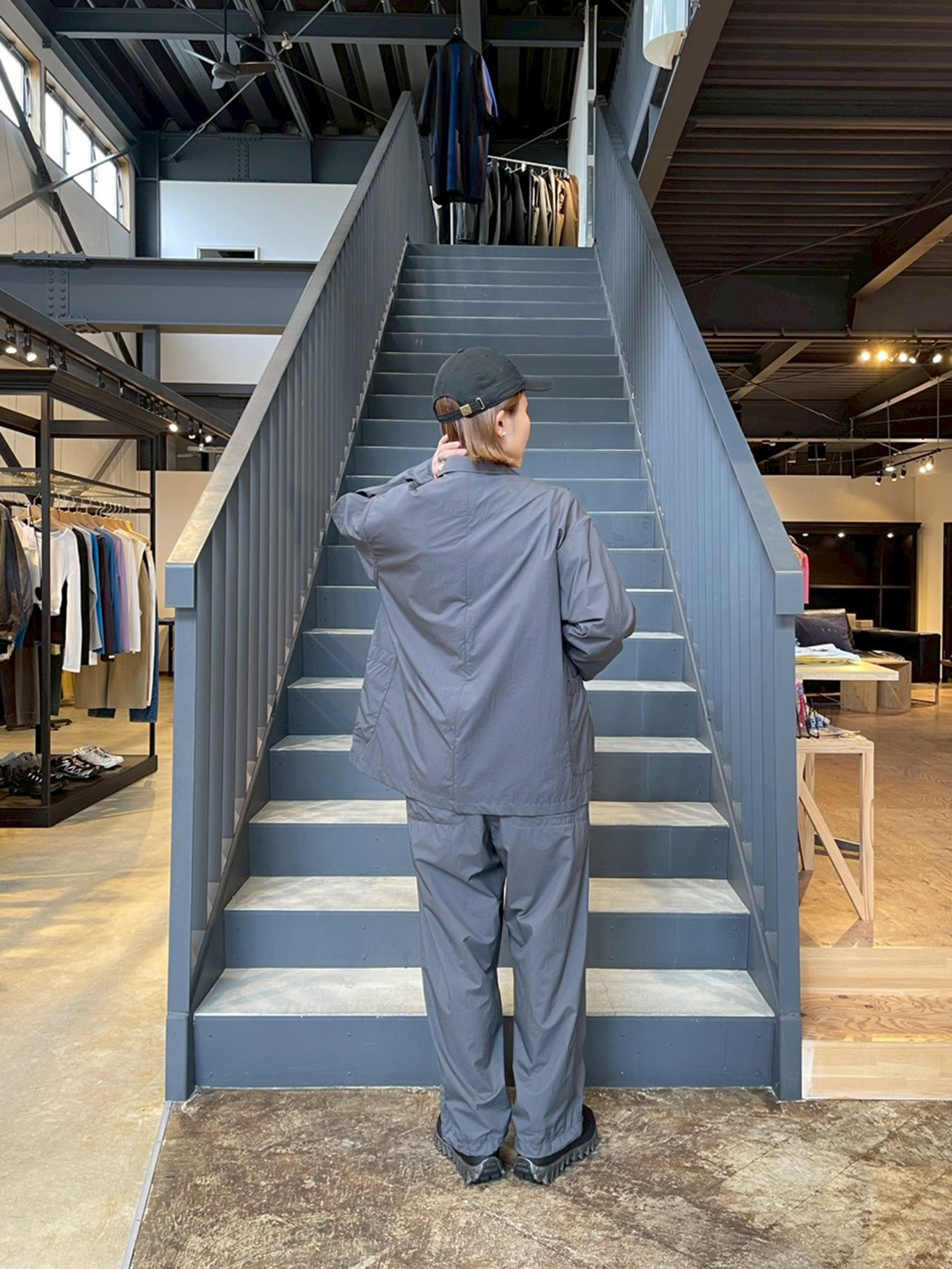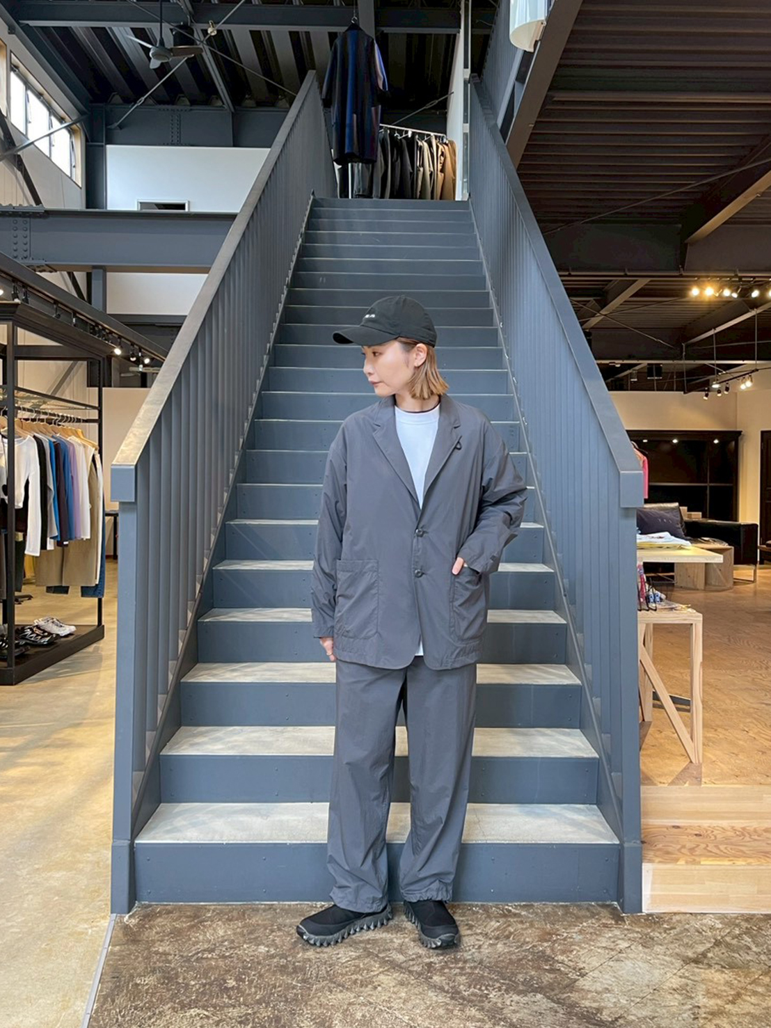 グレーのジャケットとパンツを合わせ、モダンでスポーティな雰囲気に。