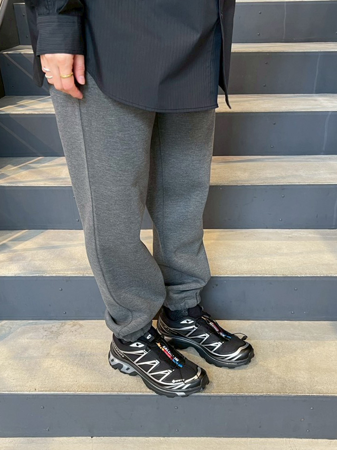 足元はSALOMON XT-6のブラックで引き締め、都会的なムードをプラス。