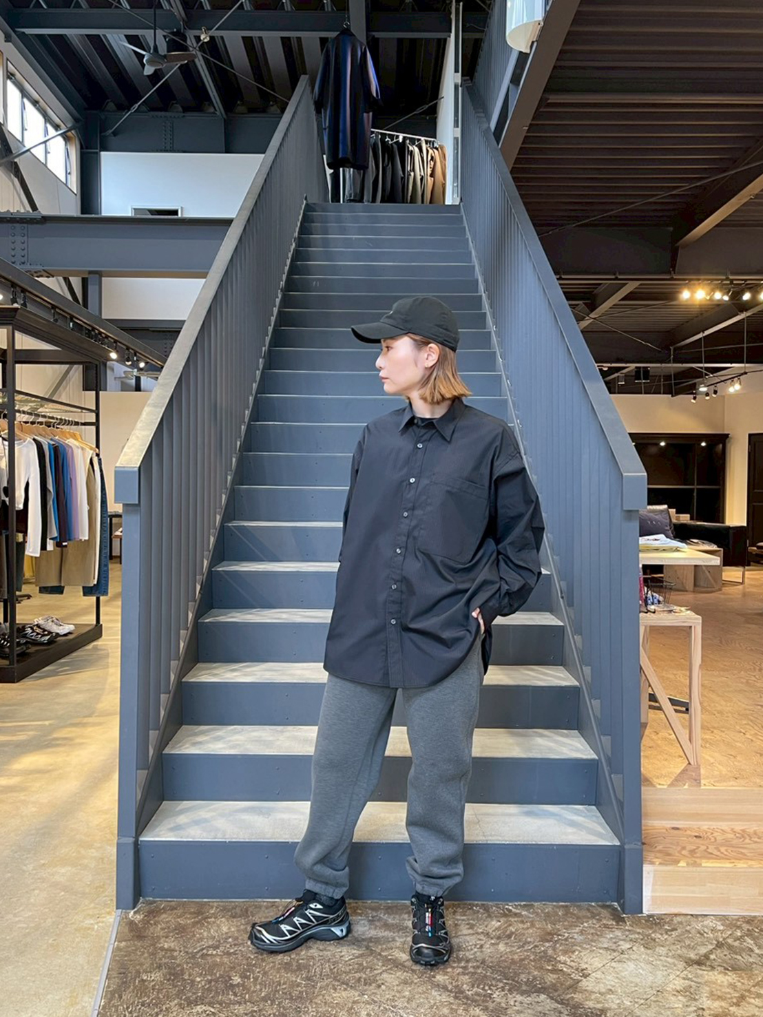 ブラックのオーバーサイズシャツにグレーのスウェットパンツを合わせたリラックス感のあるスタイル。