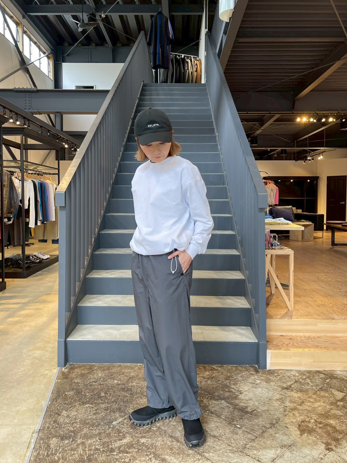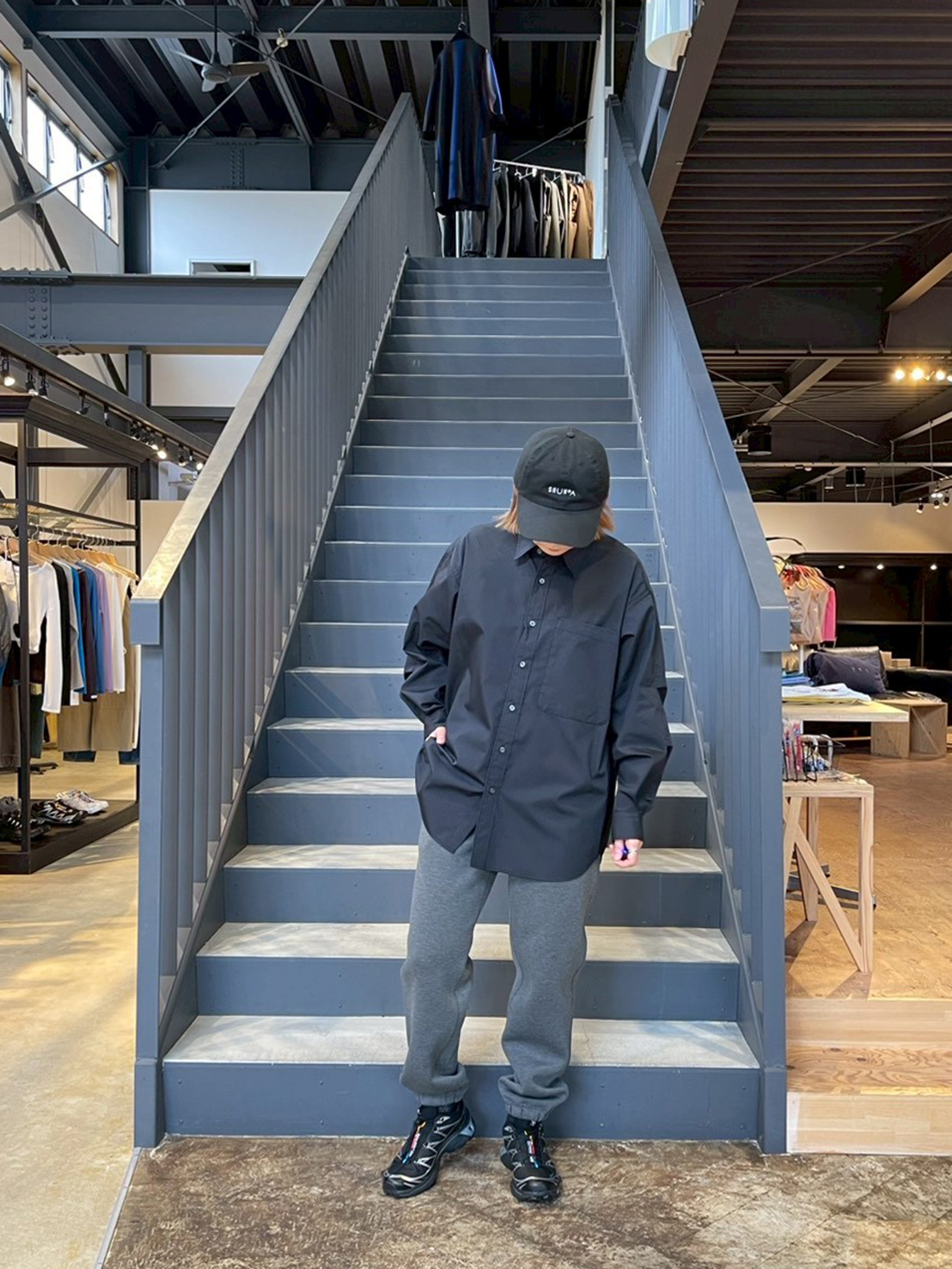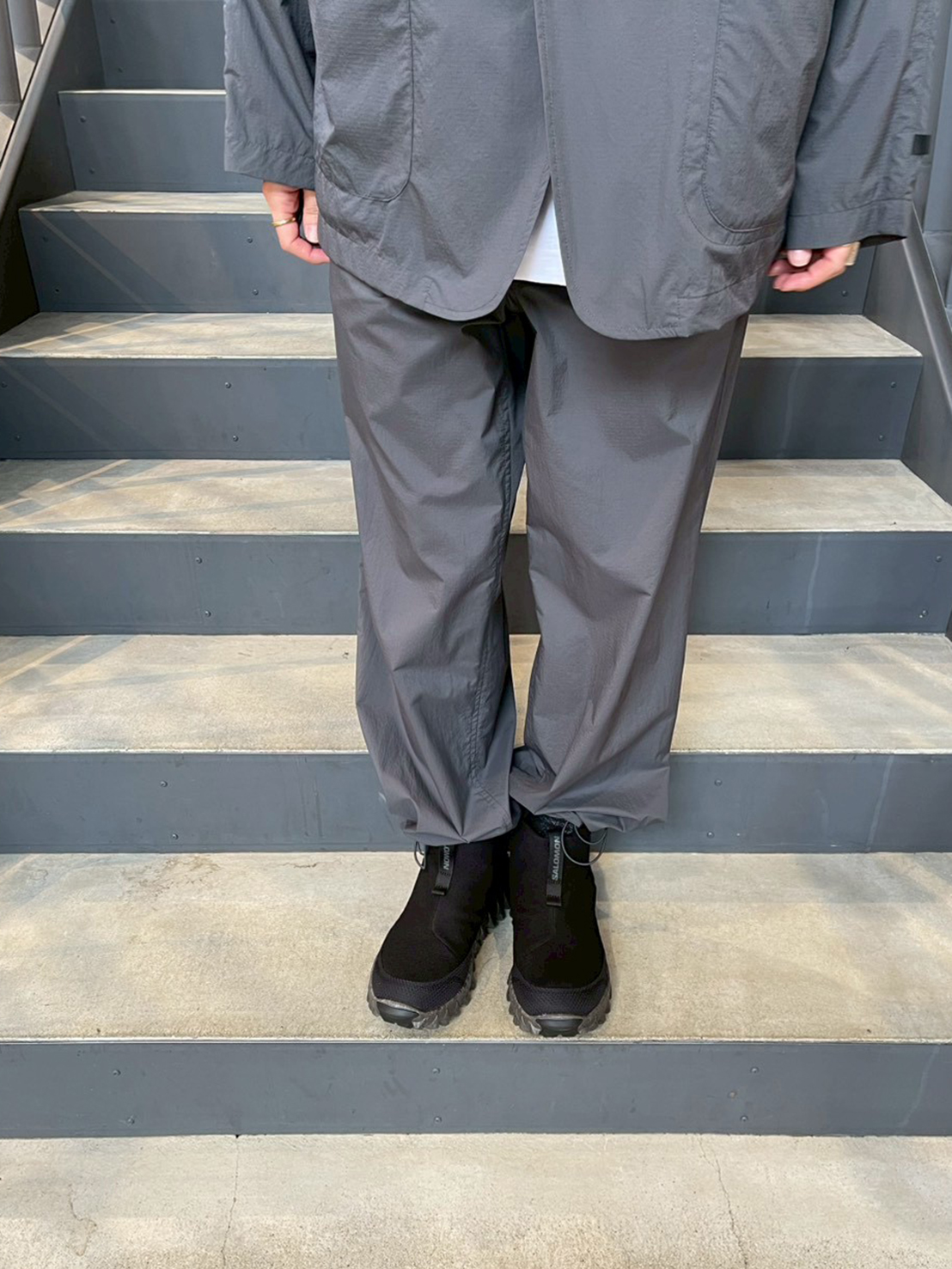 DAIWA PIER 39(ダイワピア39)のリラックスしたシルエットと、SALOMON(サロモン)のテクニカルなスニーカーは相性抜群。