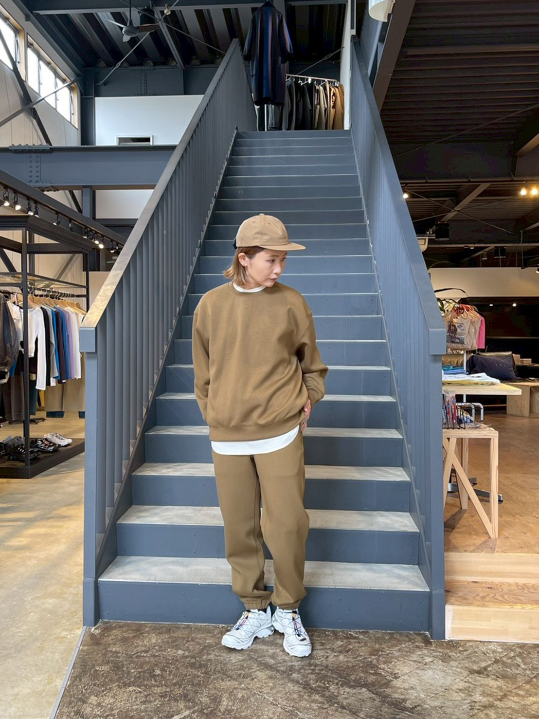 コヨーテのスウェットセットアップにホワイトのインナーをレイヤード。