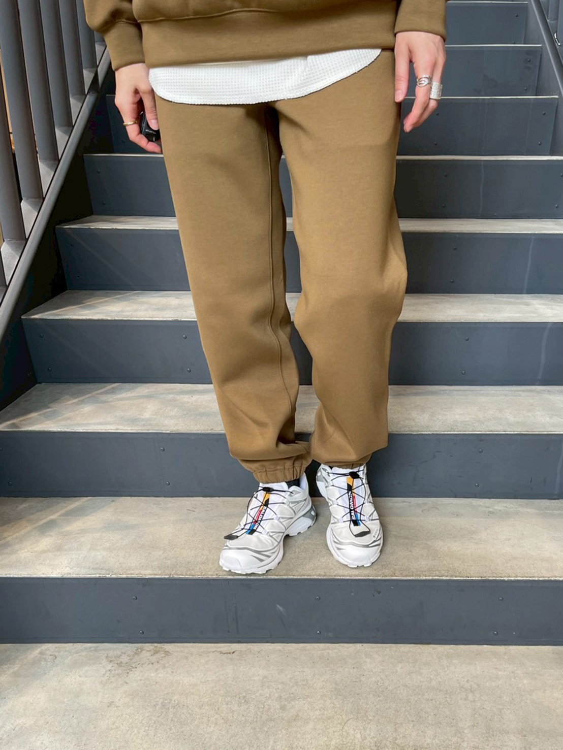 足元はSALOMON XT-6のホワイトをセレクトし、抜け感を演出。