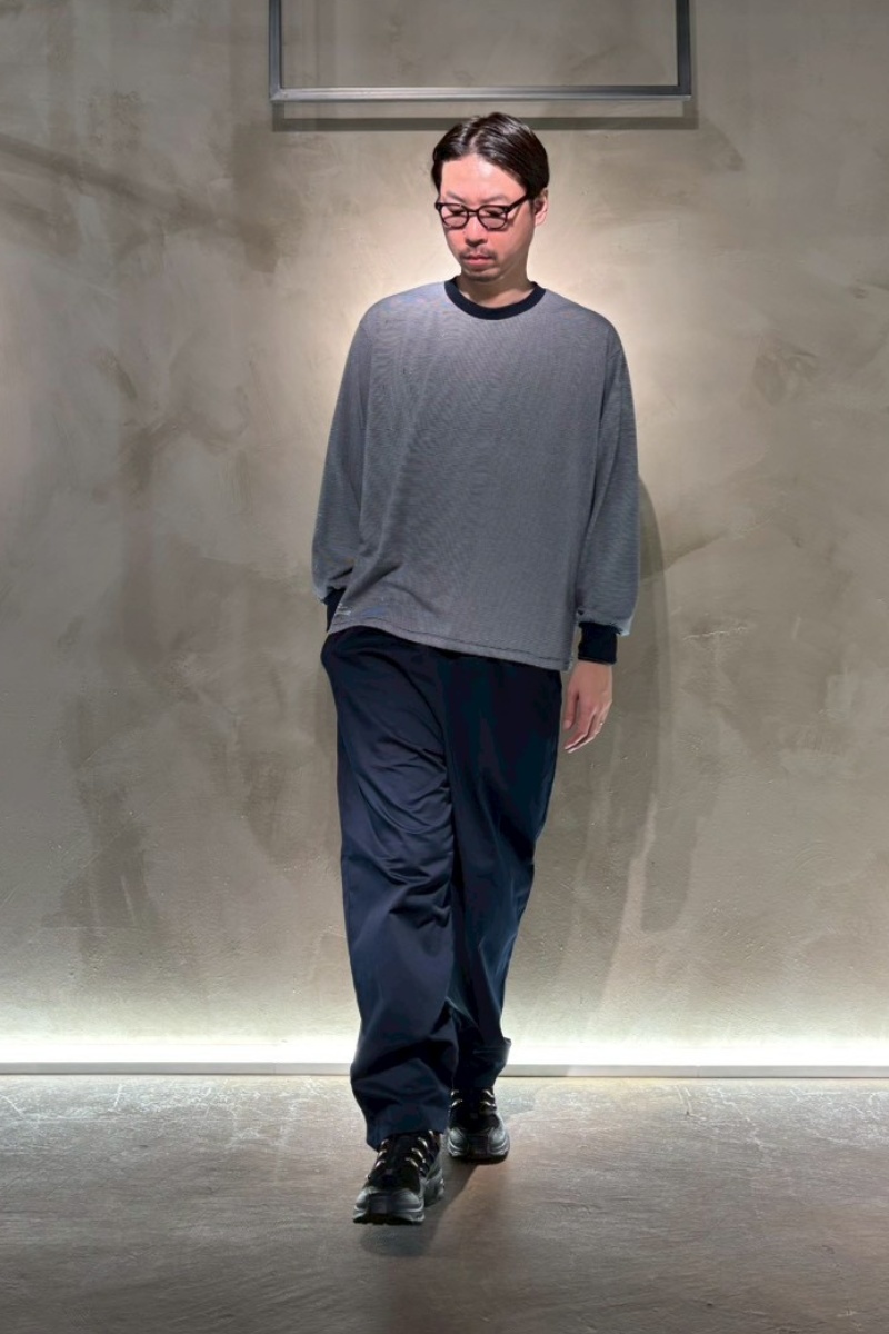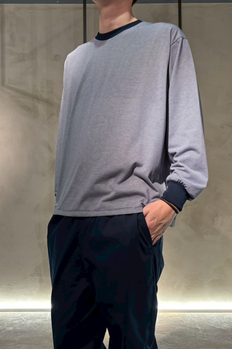 インナーに着たボーダーロンTは特殊な断面を持つポリエステル糸を使用することで、コットンのようなナチュラルな風合いを実現。