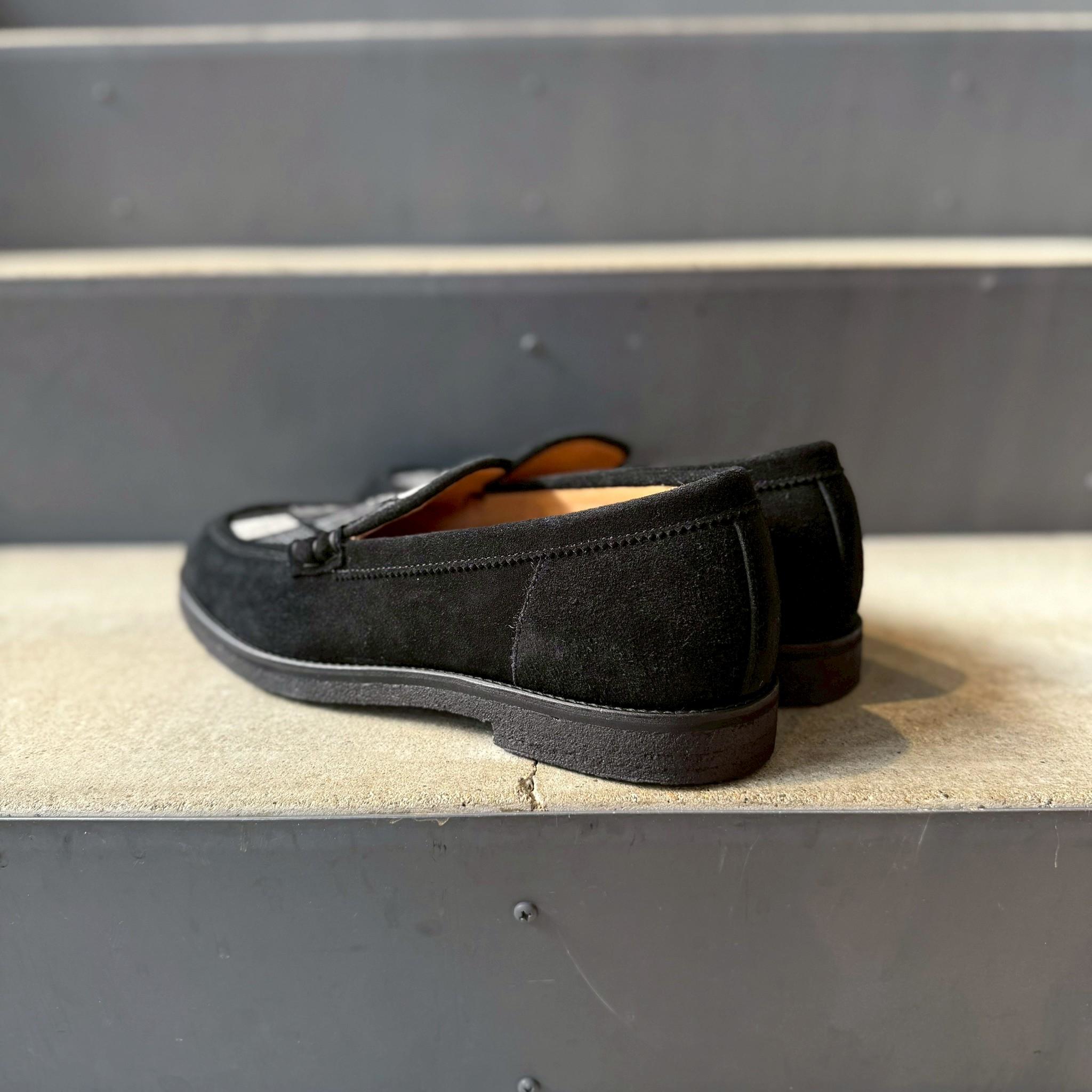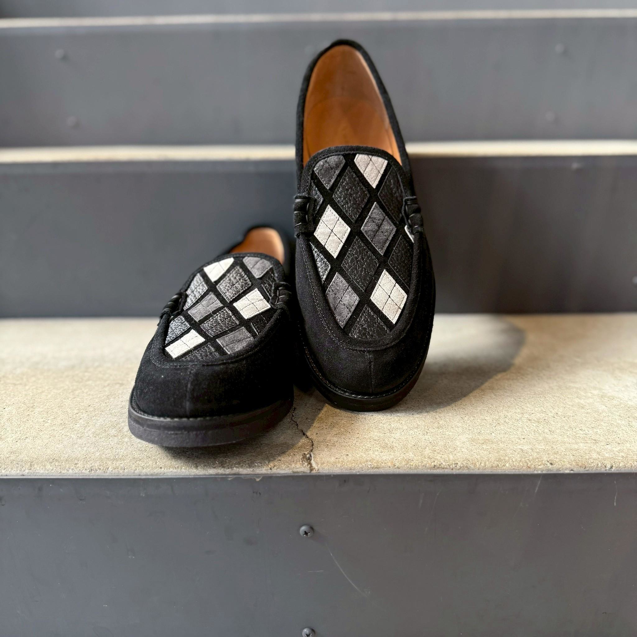 足元にはレザーの陰影が美しい argyle loafer を。立体的なアーガイルステッチが程よい主張になり、軽快さと存在感を両立した一足です。
