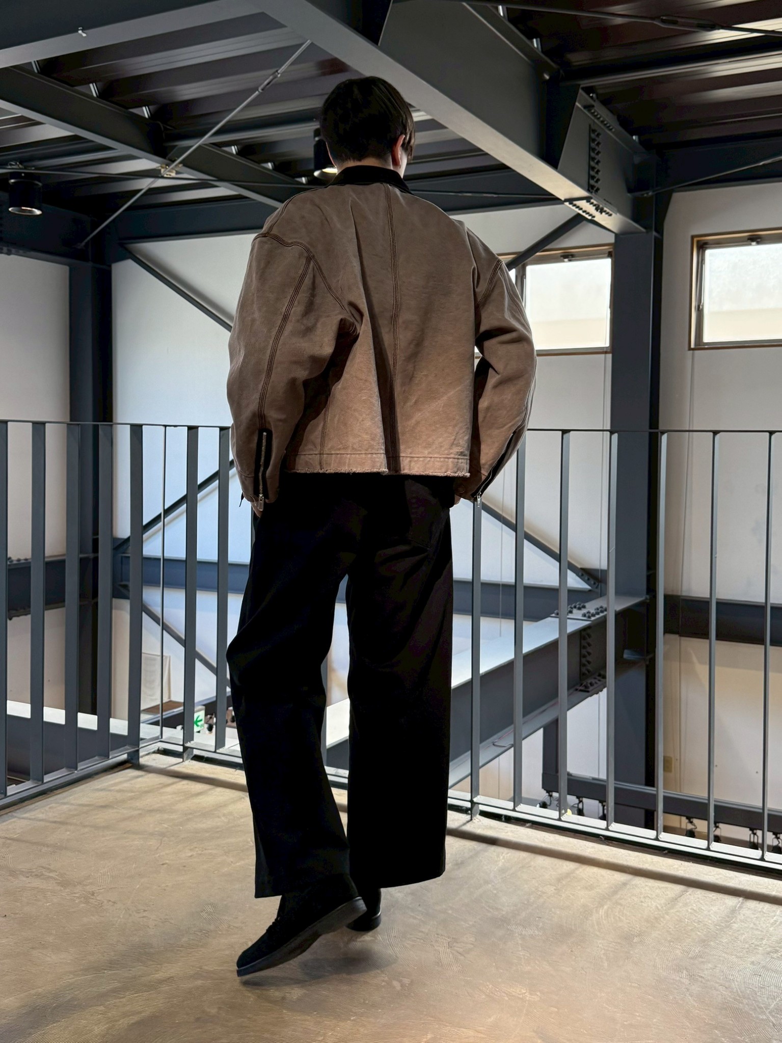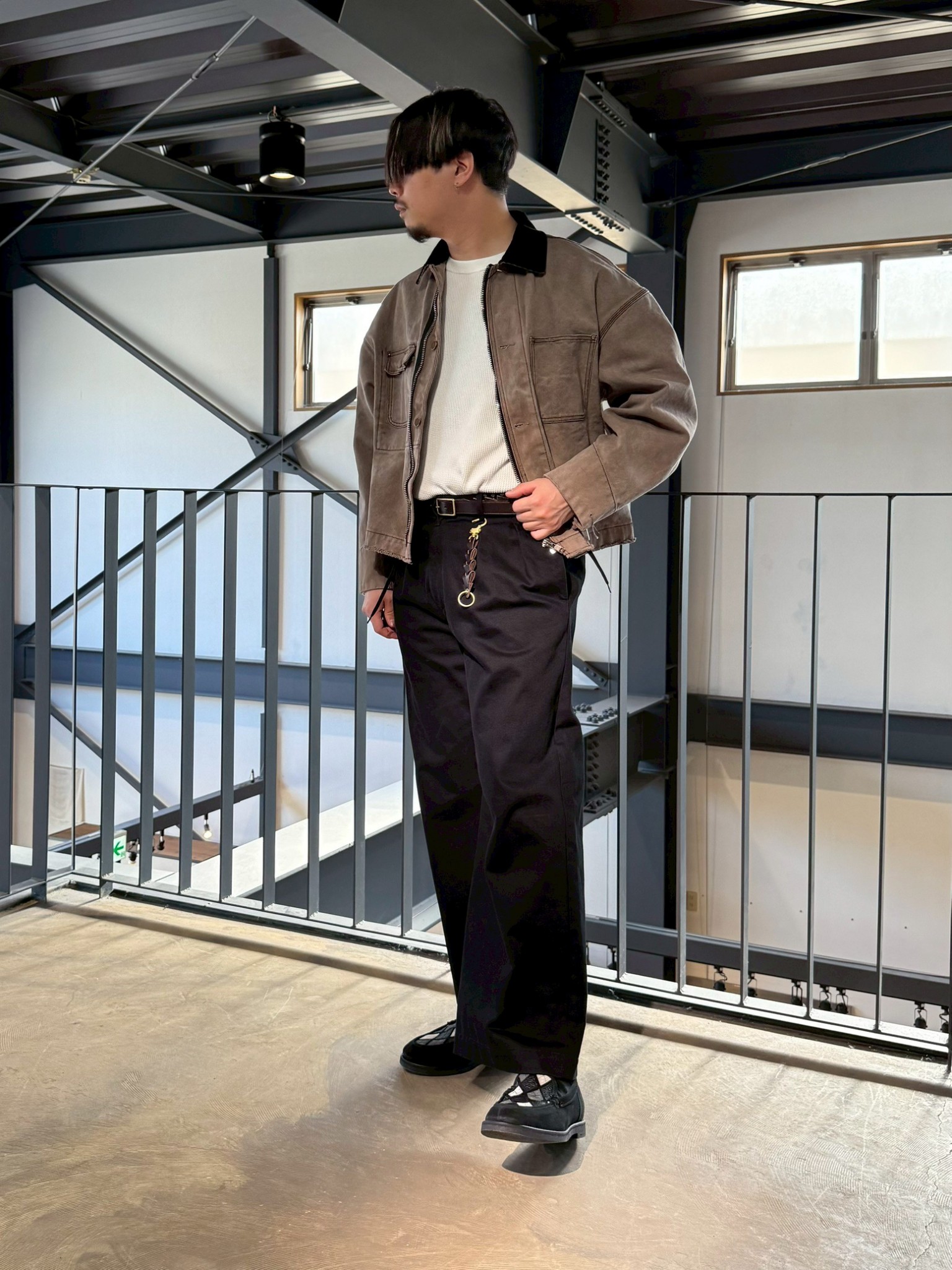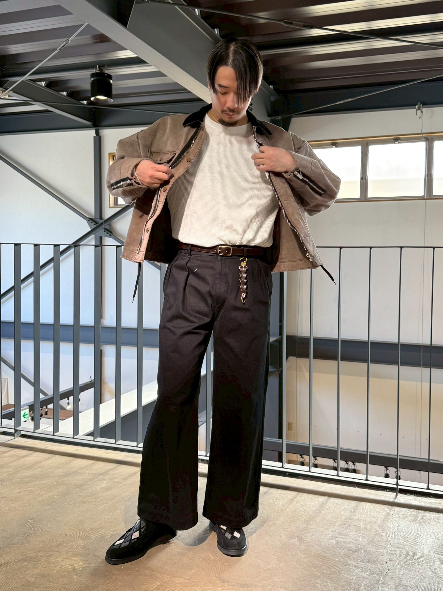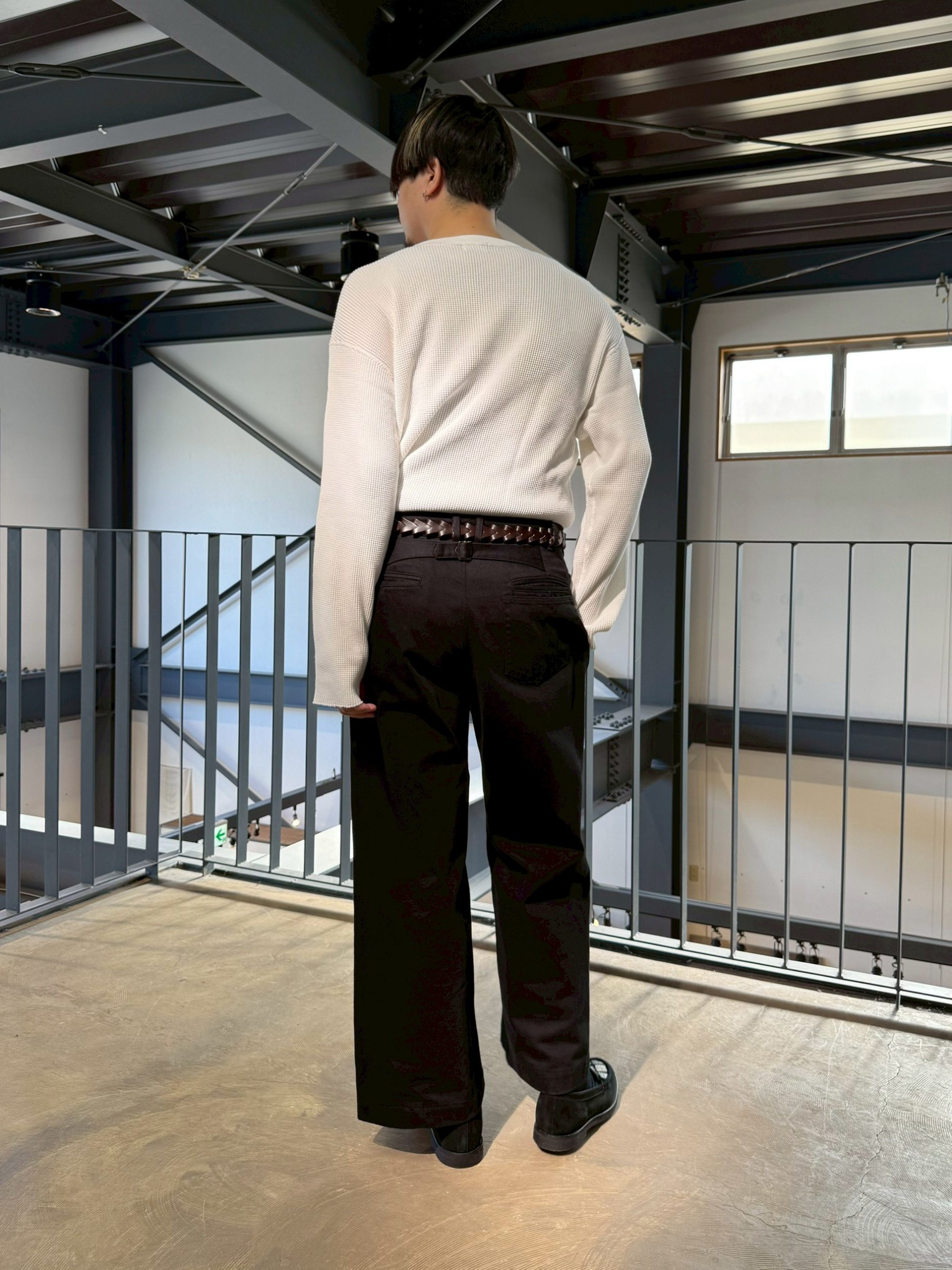 同じくダークブラウンの construct belt は無駄のないミニマルなバックルデザインで、上質な革の厚みと奥行きある色味が魅力。ミリタリージャケットやワイドパンツと合わせることで、カジュアルな装いを品良くまとめてくれます。