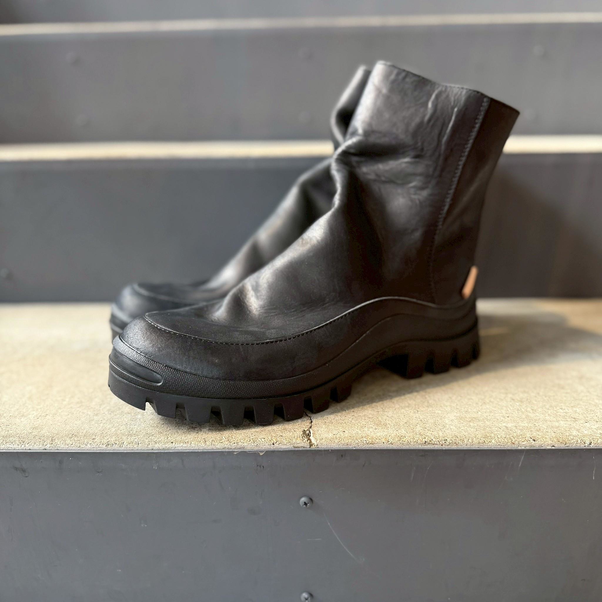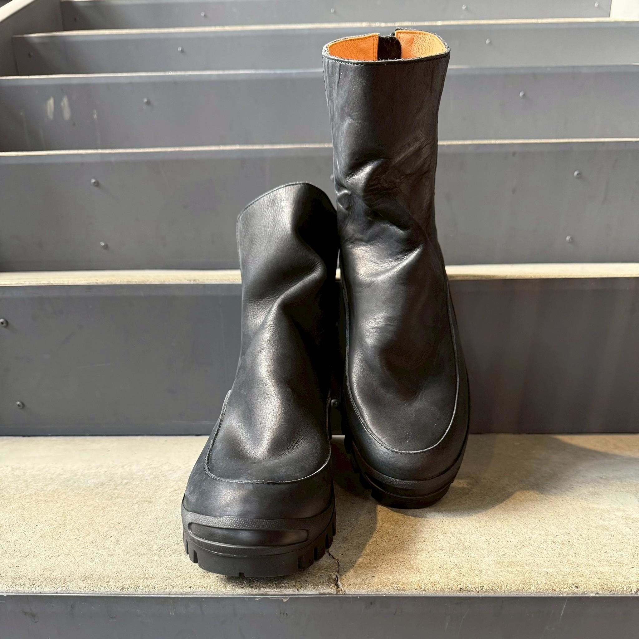 足元には、人気の backzip #2146 を採用。踵のジップが印象的なミニマルブーツで、フラットでシャープなシルエットがコーディネート全体を都会的に仕上げてくれます。