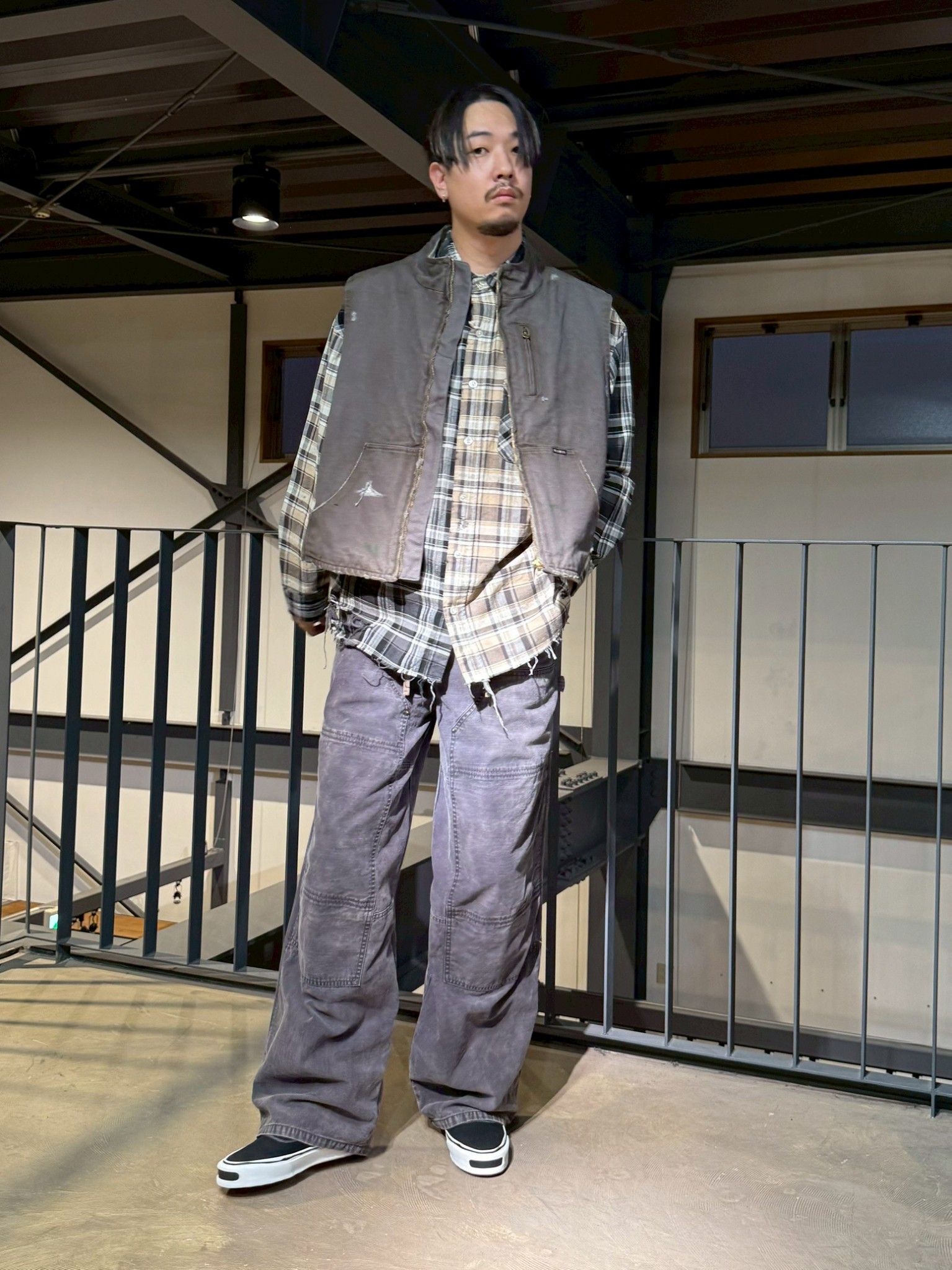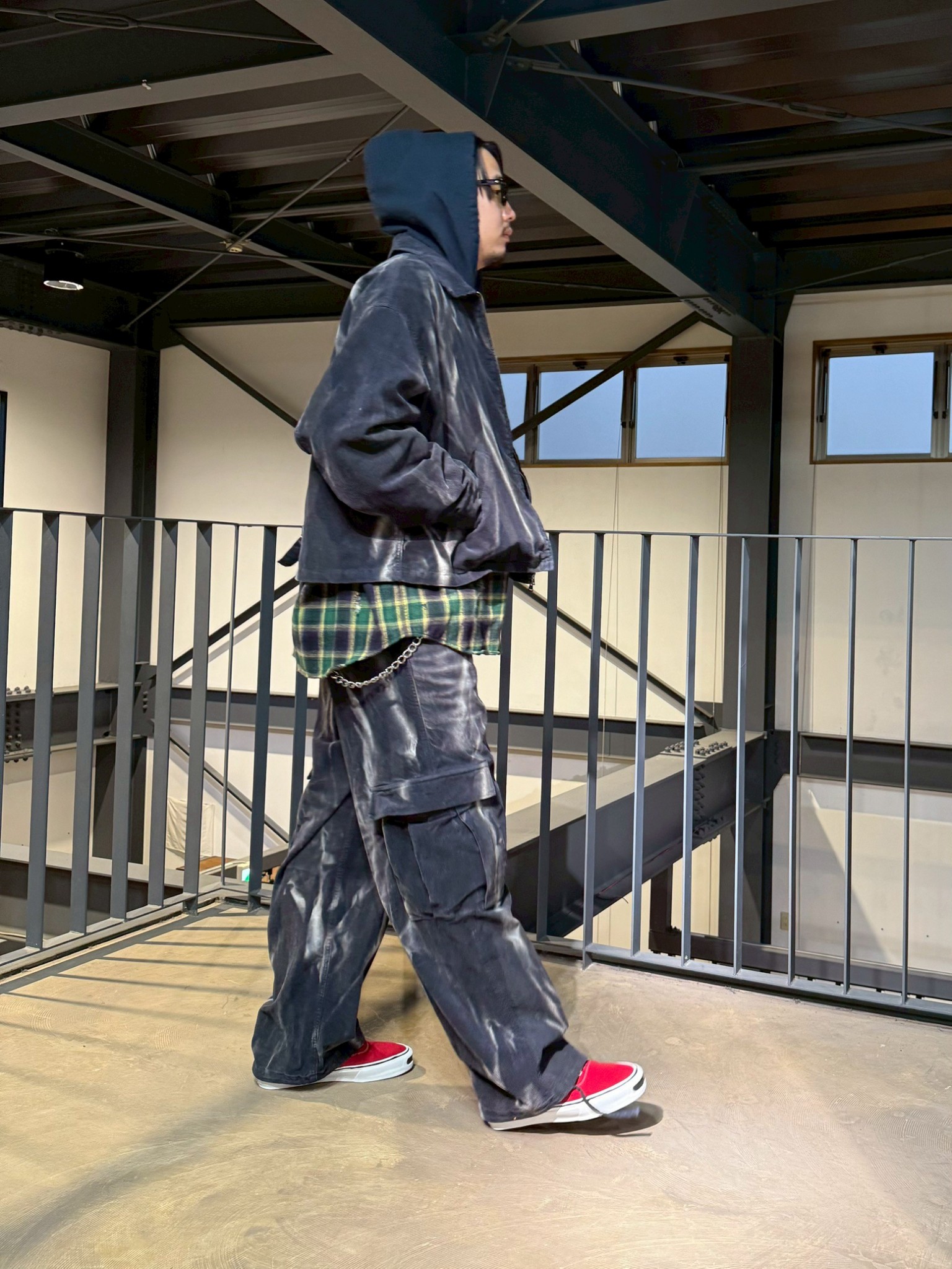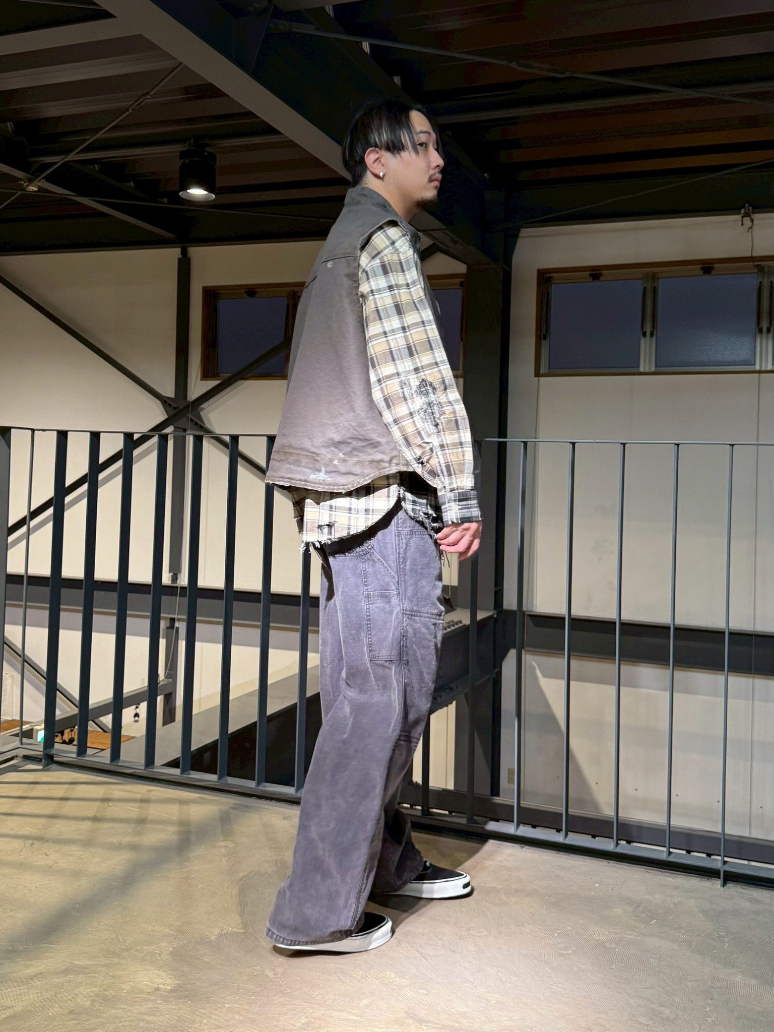 ボトムはステイン加工ペインターパンツで、ワーク感を強めつつもだらしなく見えない絶妙なシルエット。