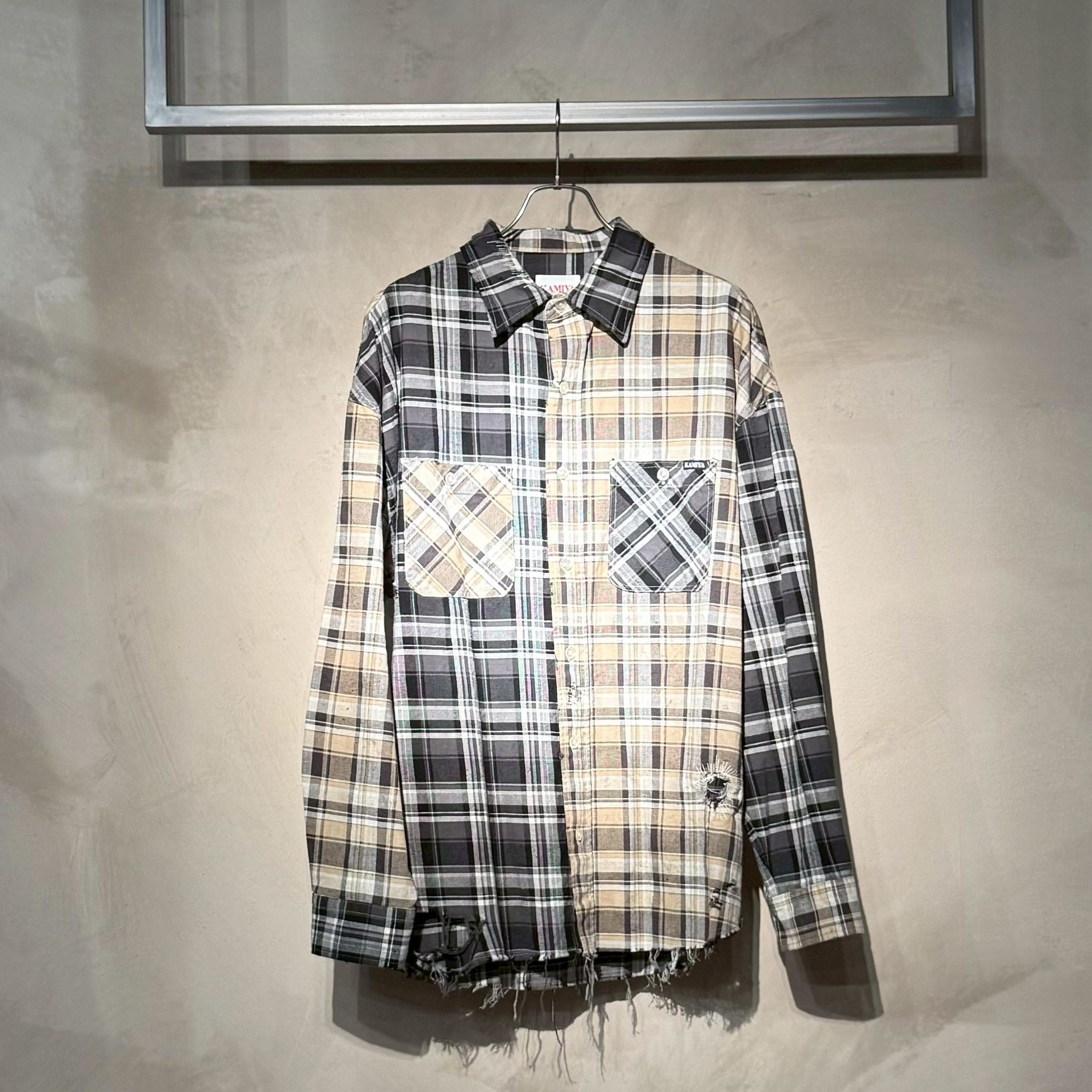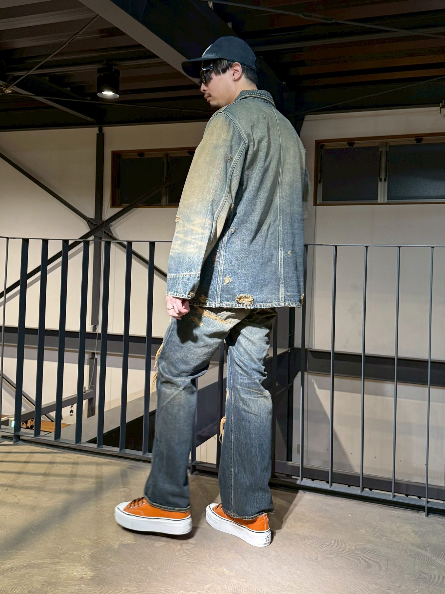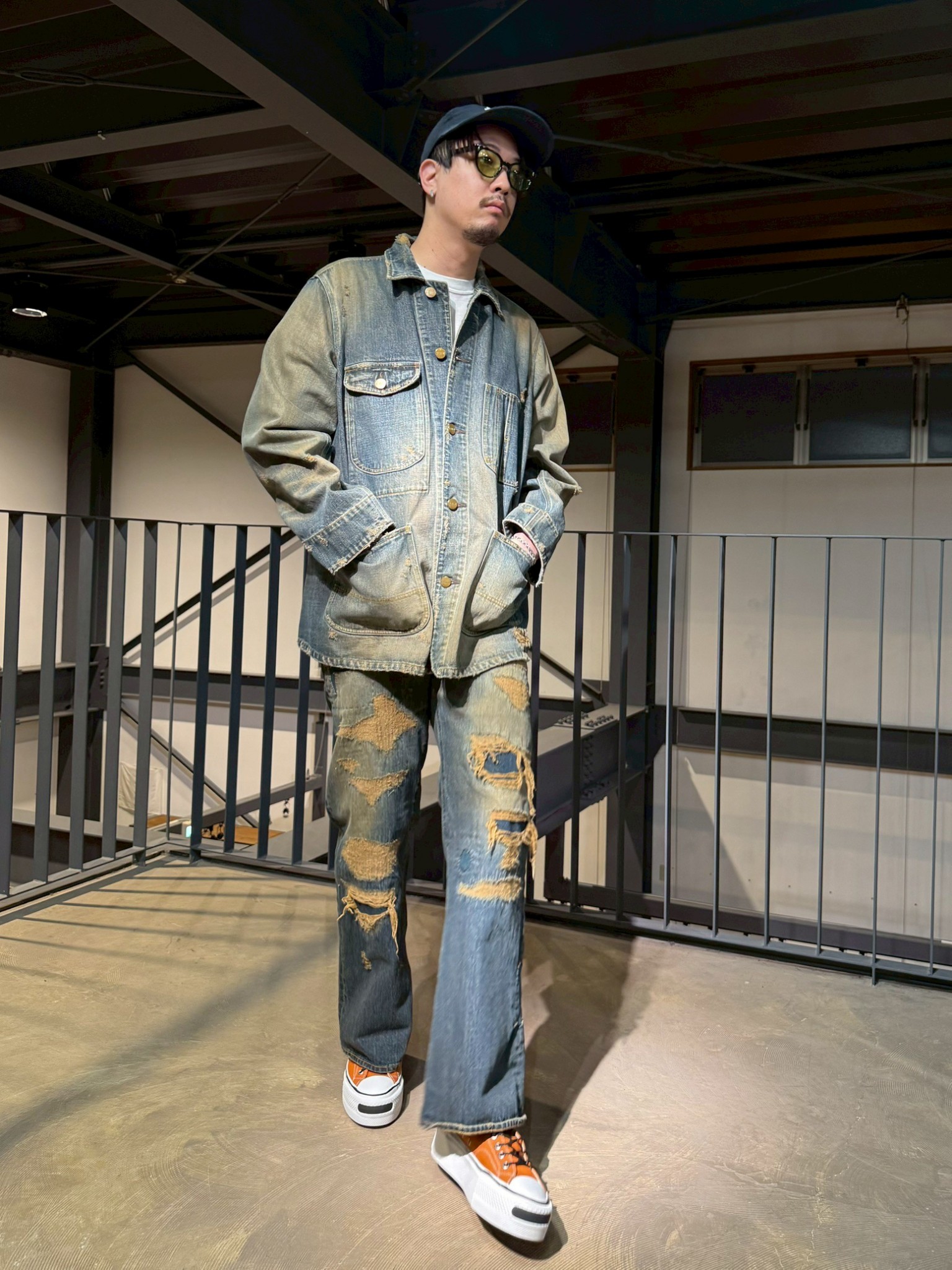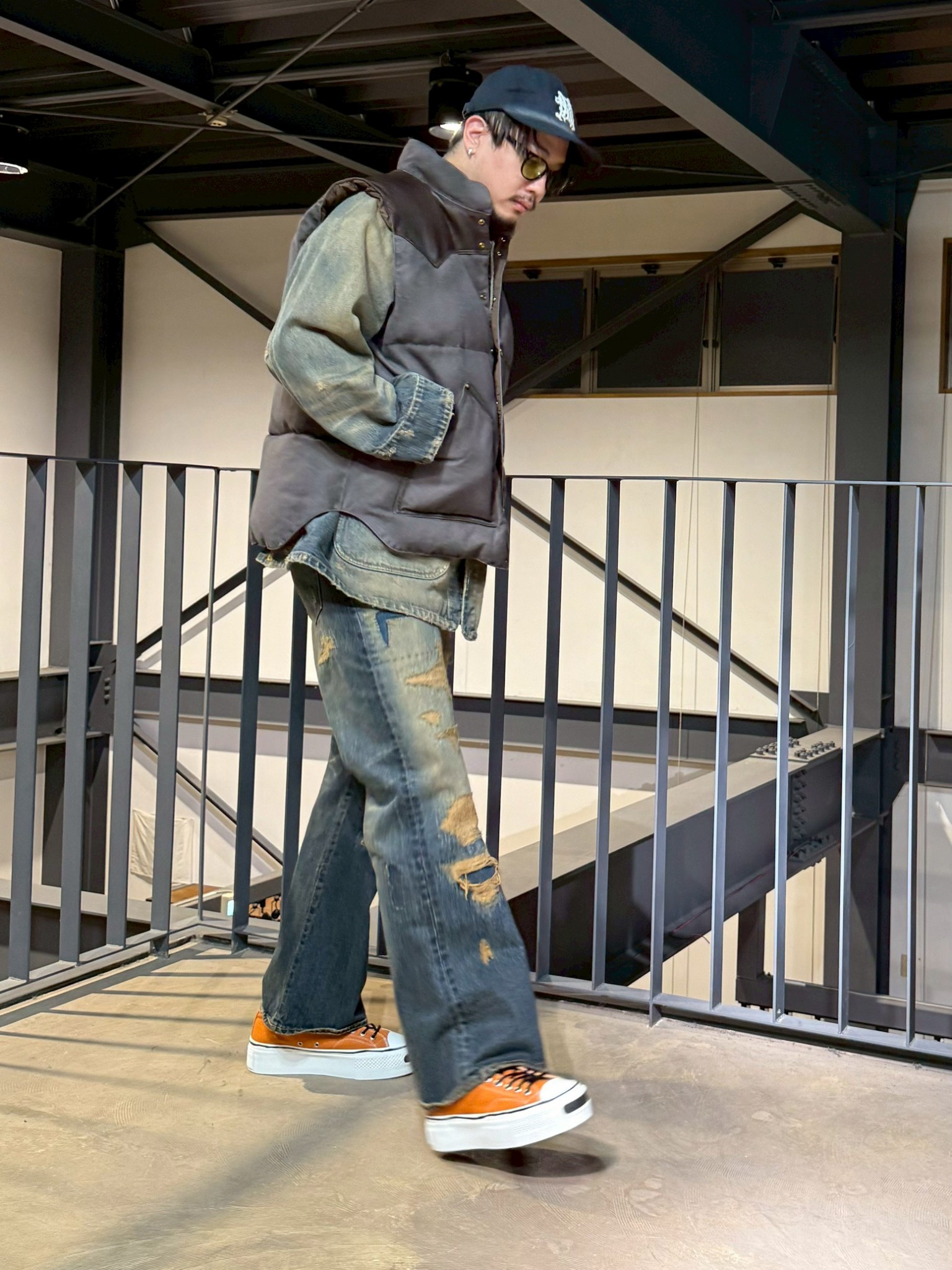 パンツはKAMIYA(カミヤ)らしいBORO加工 × ブーツカットで、ヴィンテージ感をモードに昇華。