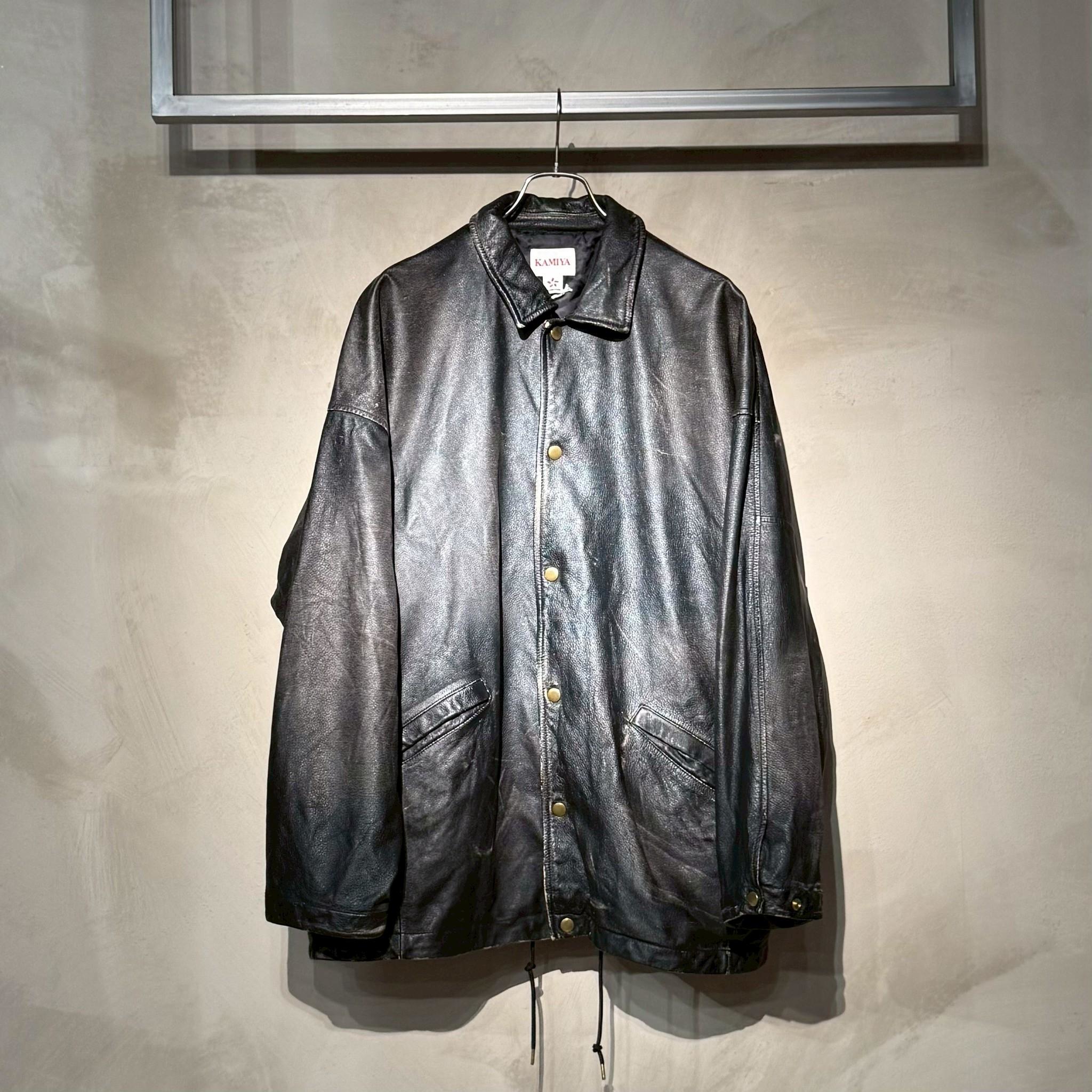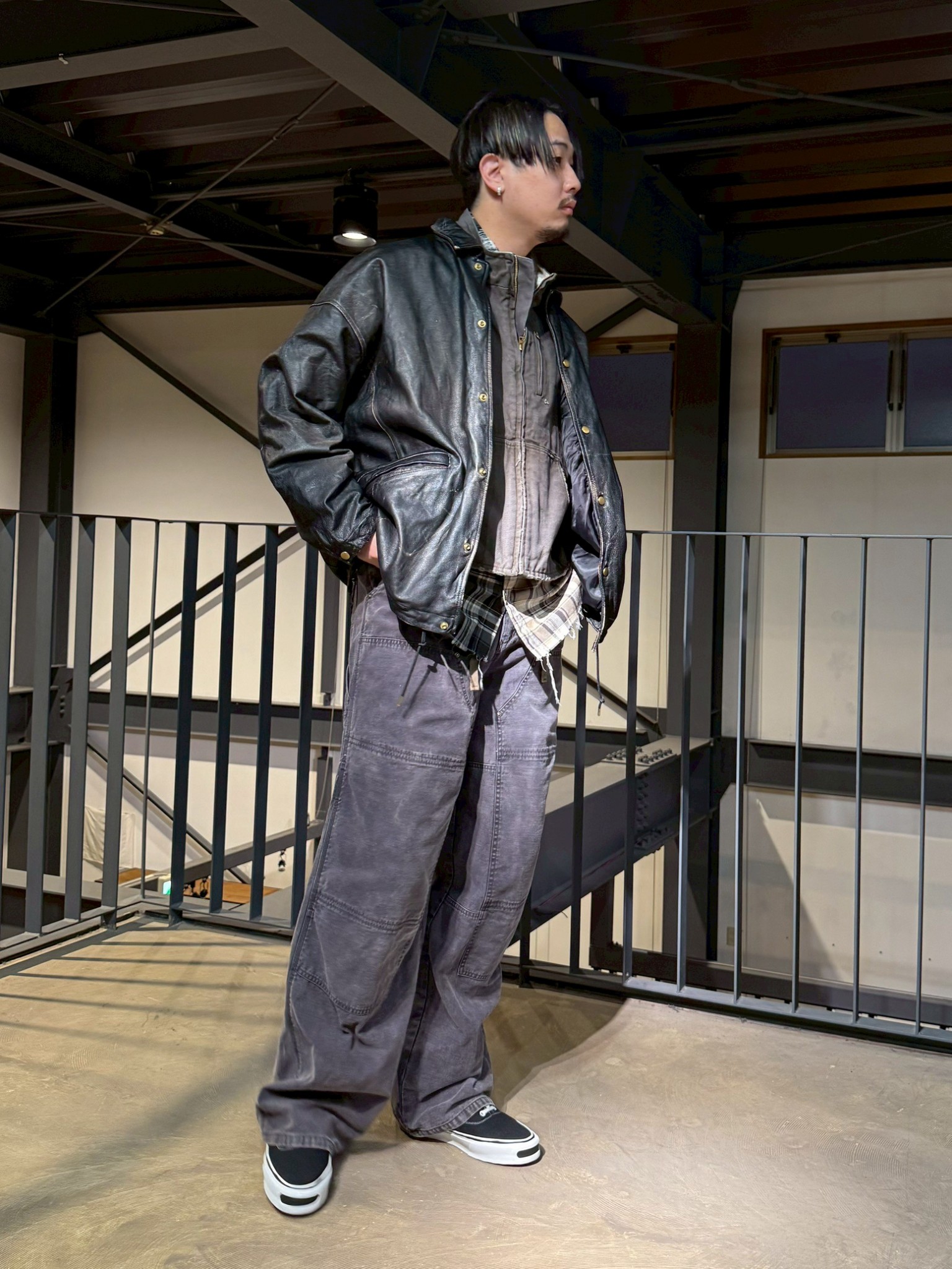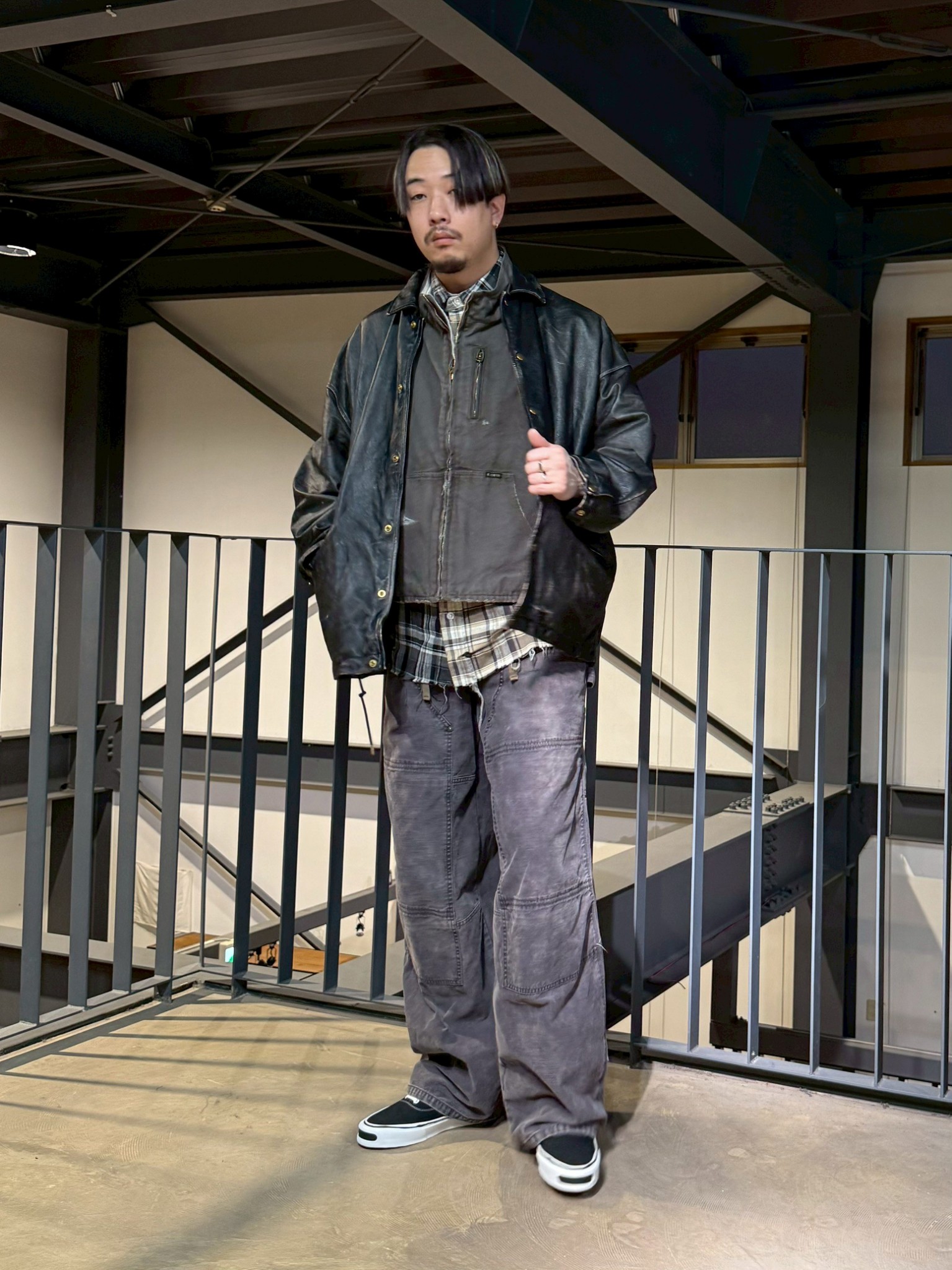 ダメージレザーのコーチジャケットに、BOROダックベストを重ねた、素材感で魅せるスタイル。