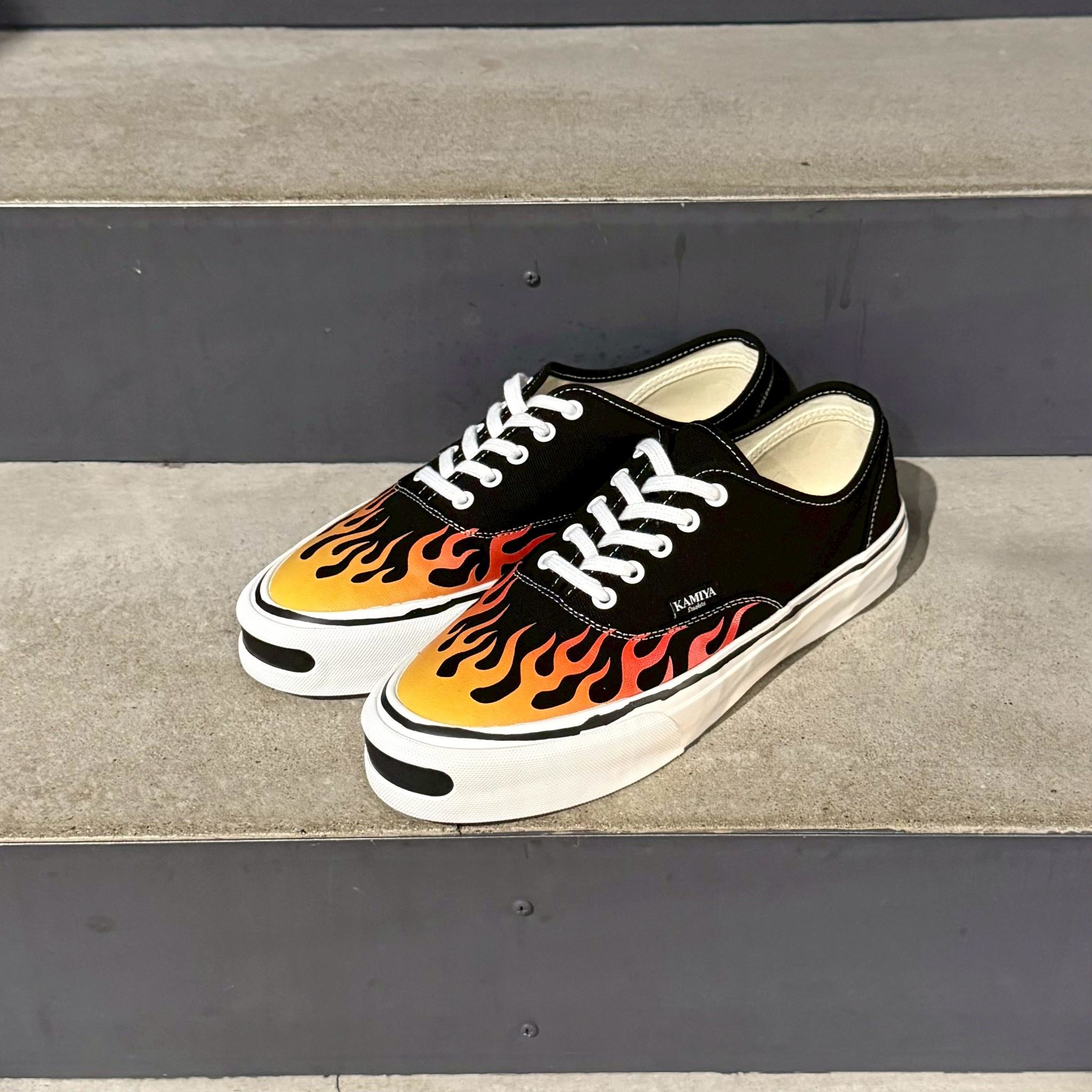 足元にはFire Pattern Hercを合わせ、炎のモチーフで統一感のあるスタイリングに仕上げています。
