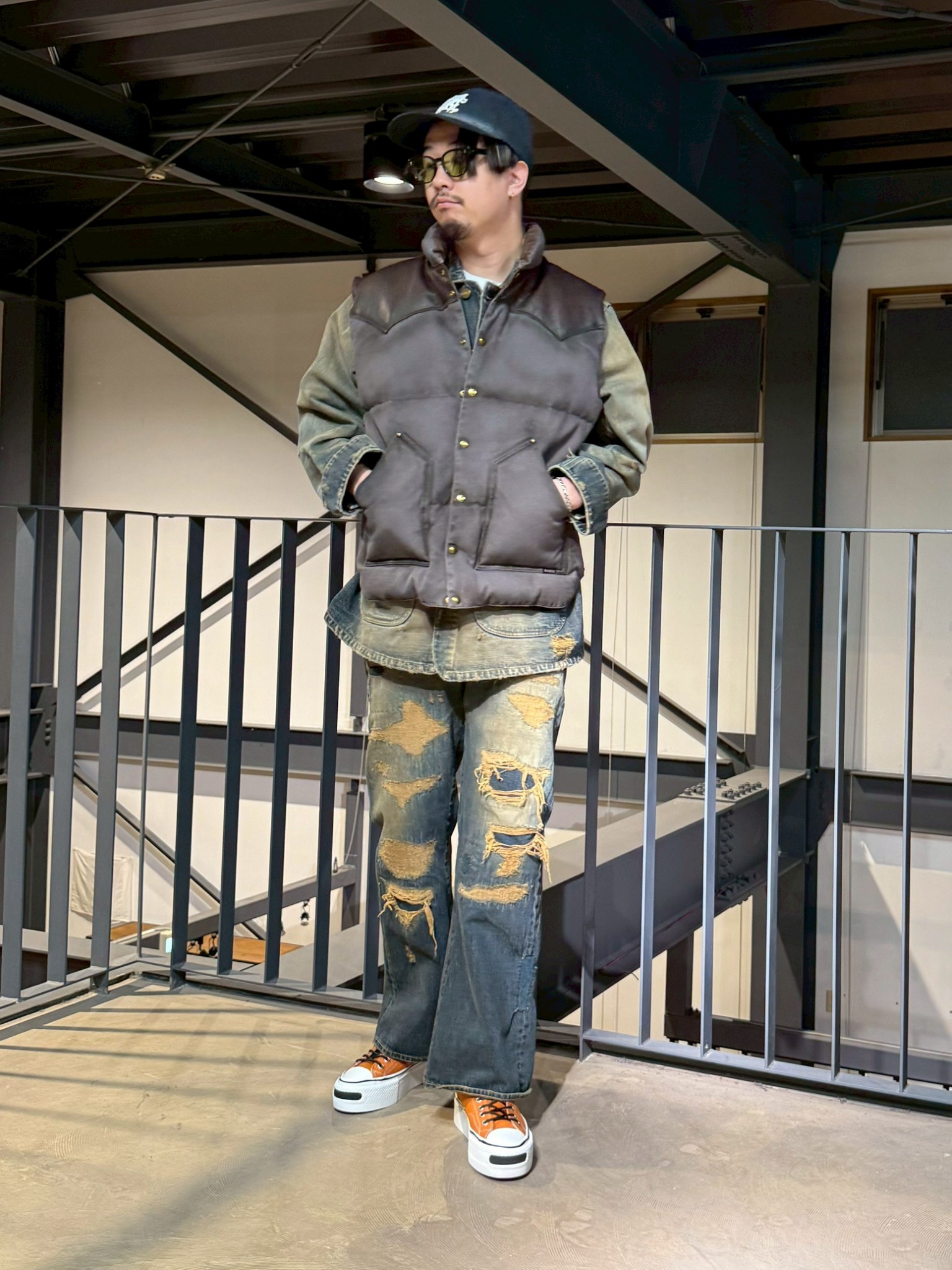 Rocky Mountain × KAMIYA(カミヤ) のダック地ダウンベストを主役に、デニムチョアコートを合わせたアメカジベースのレイヤード。