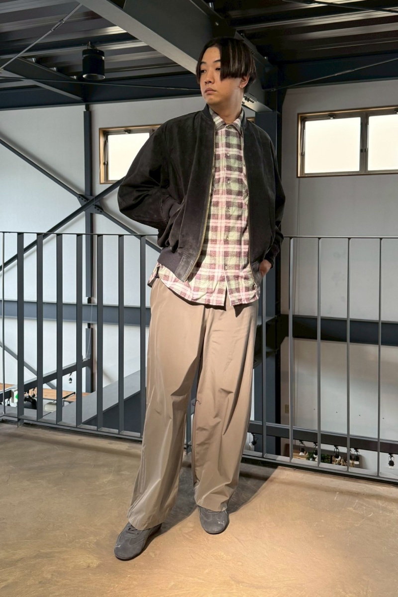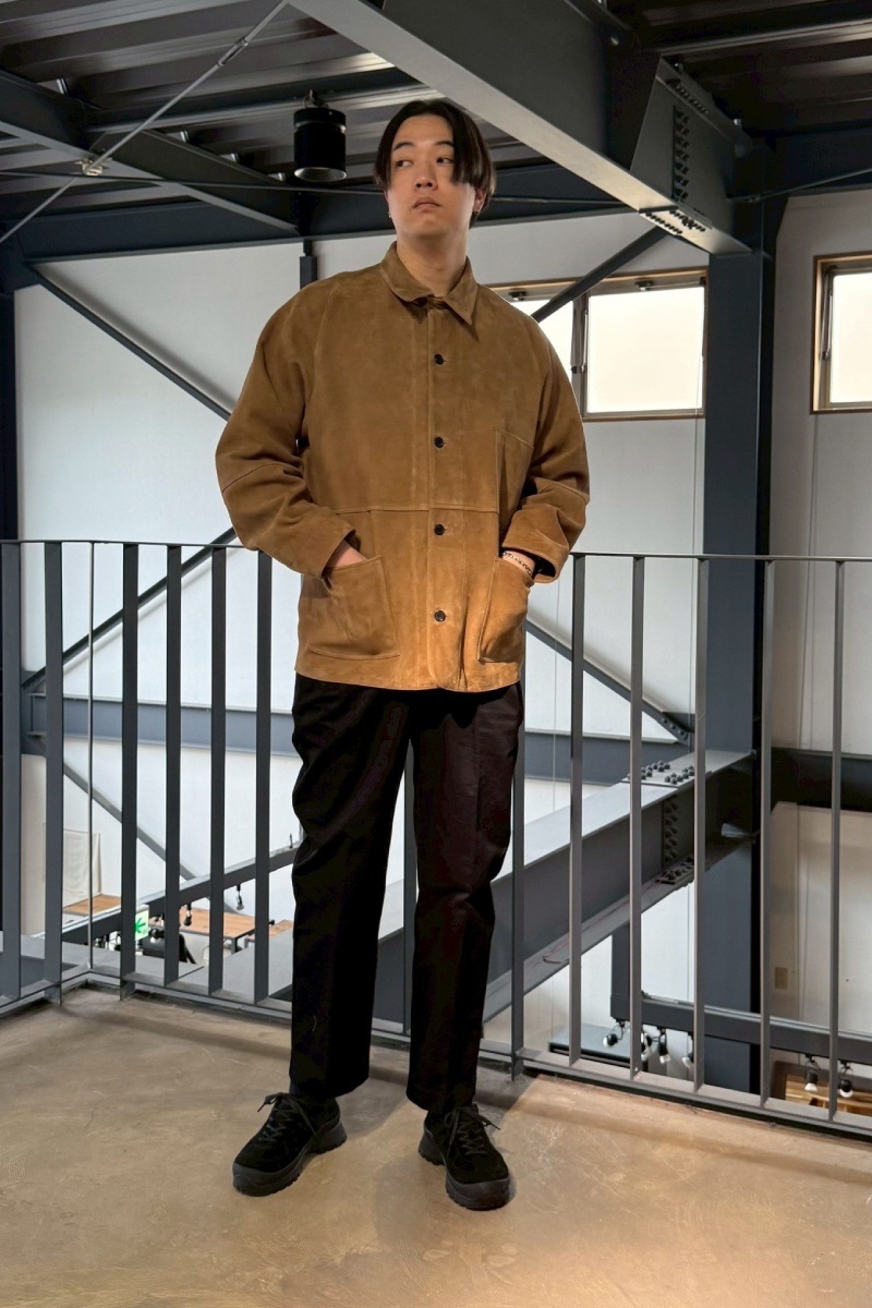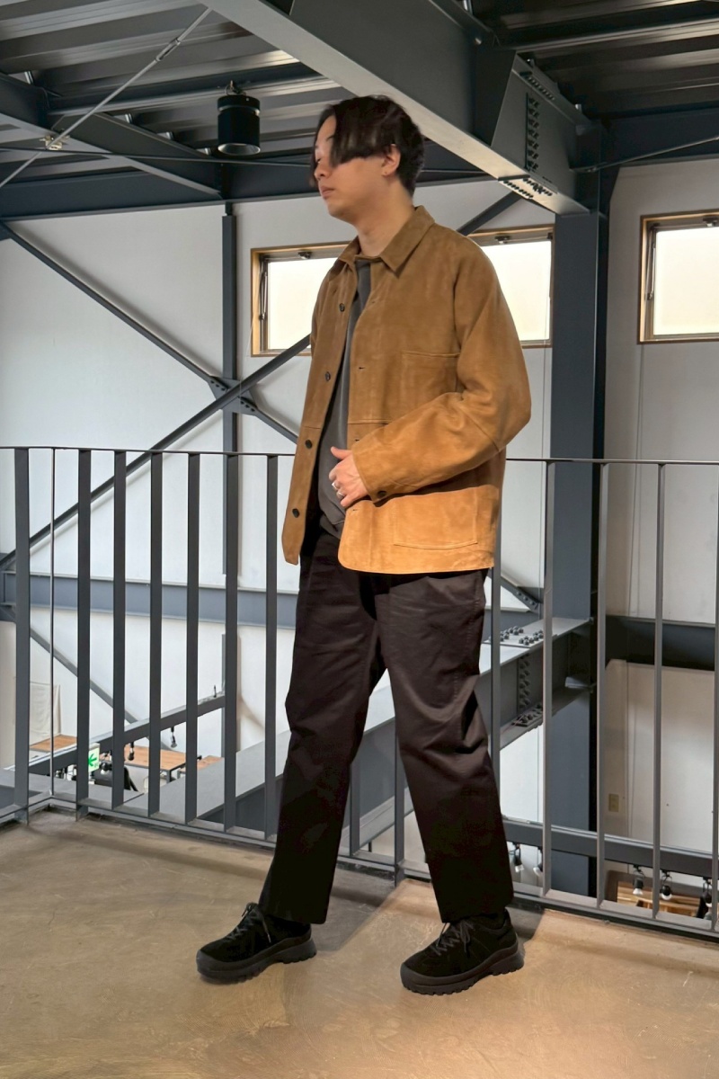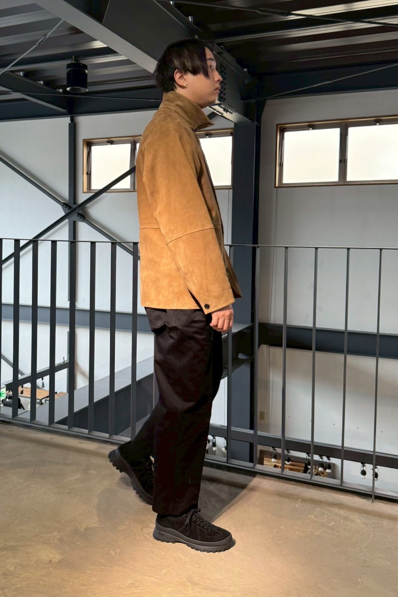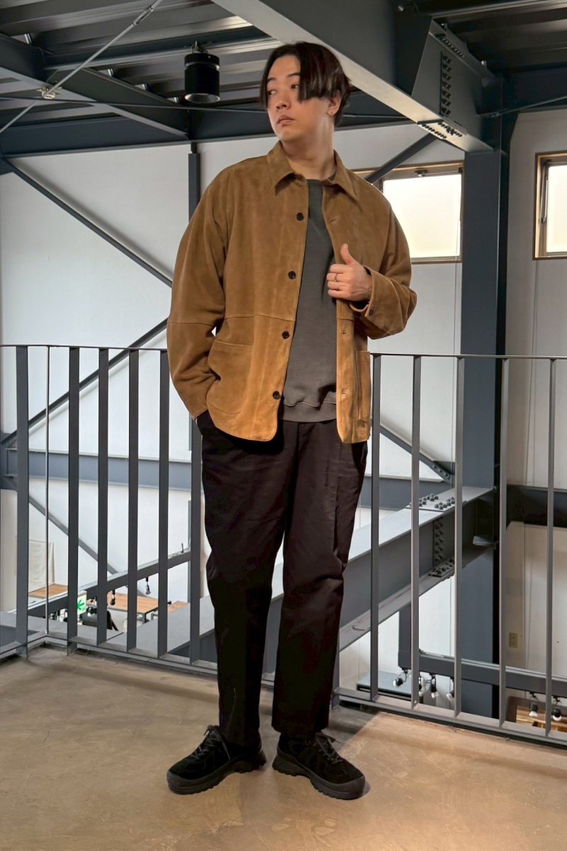 スエードの落ち感を活かして、レザー特有の硬さを感じさせないスタイルに。
