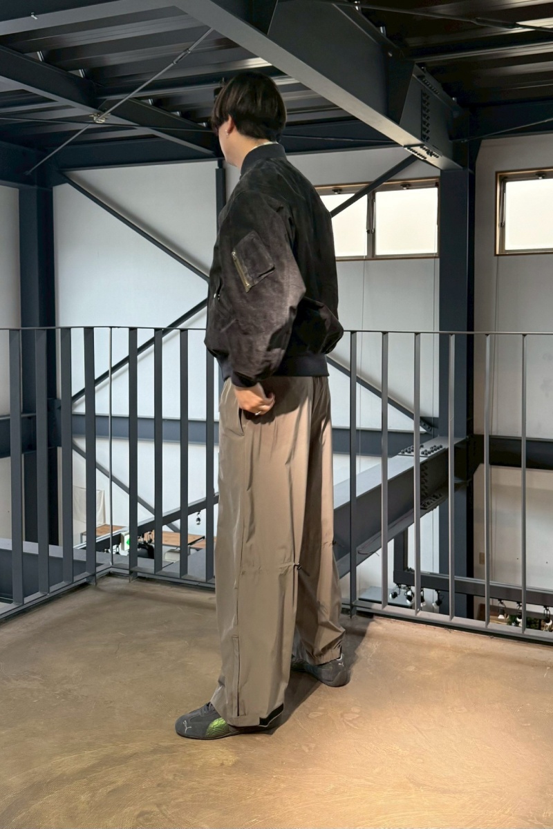 「スエードボンバーで“縦の余裕”を作る。高身長のための上品ミリタリー」