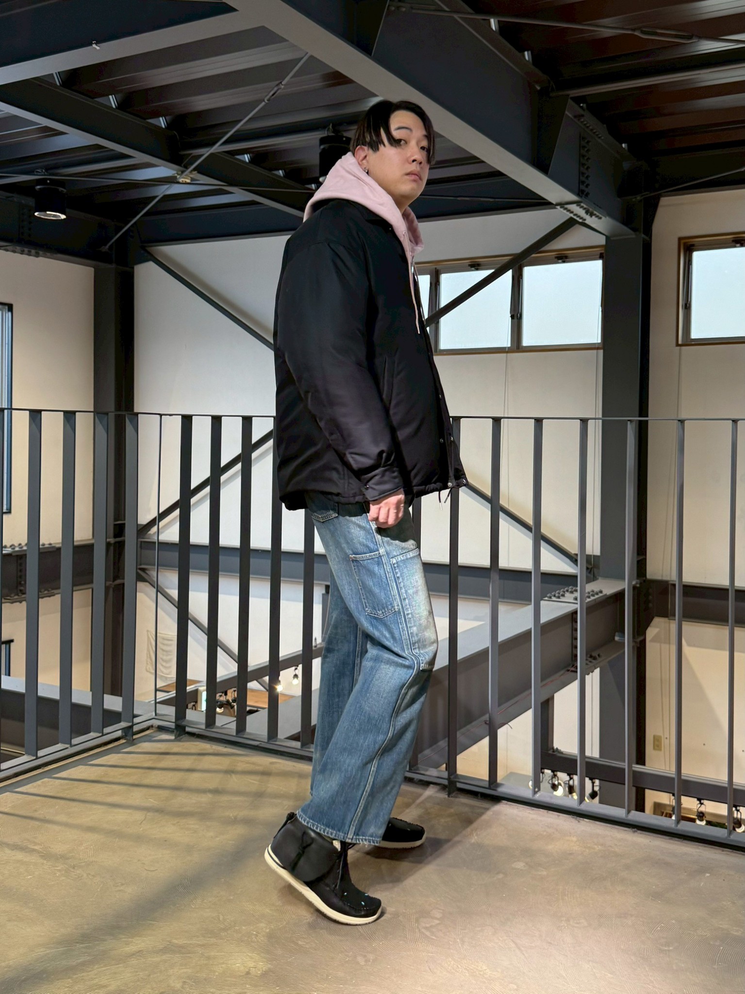 冬アウターであるコーチダウンジャケットに、差し色として PINKの”KINCHAKU” ZIPUP HOODIE(キンチャクジップアップフーディー)を投入。