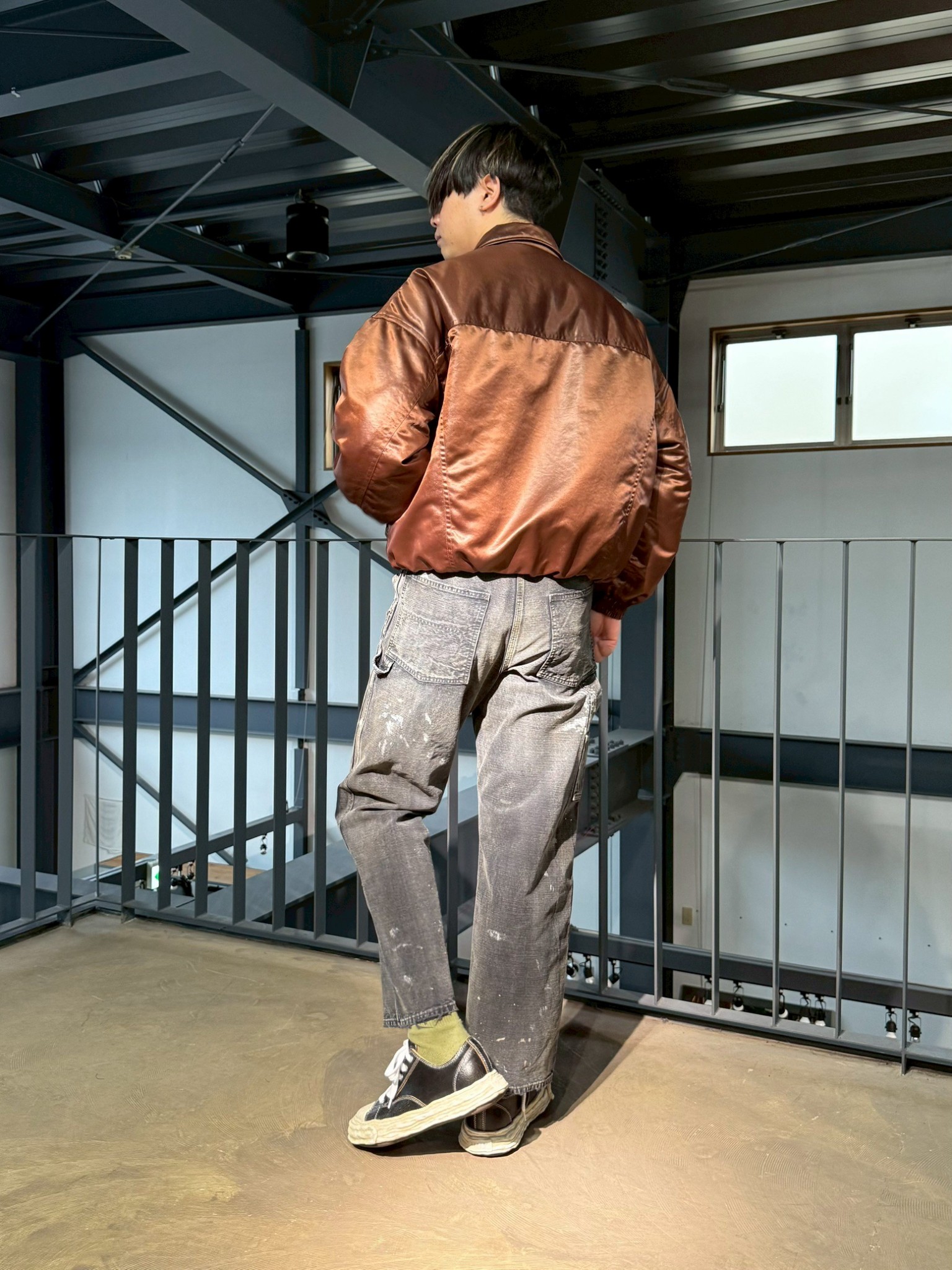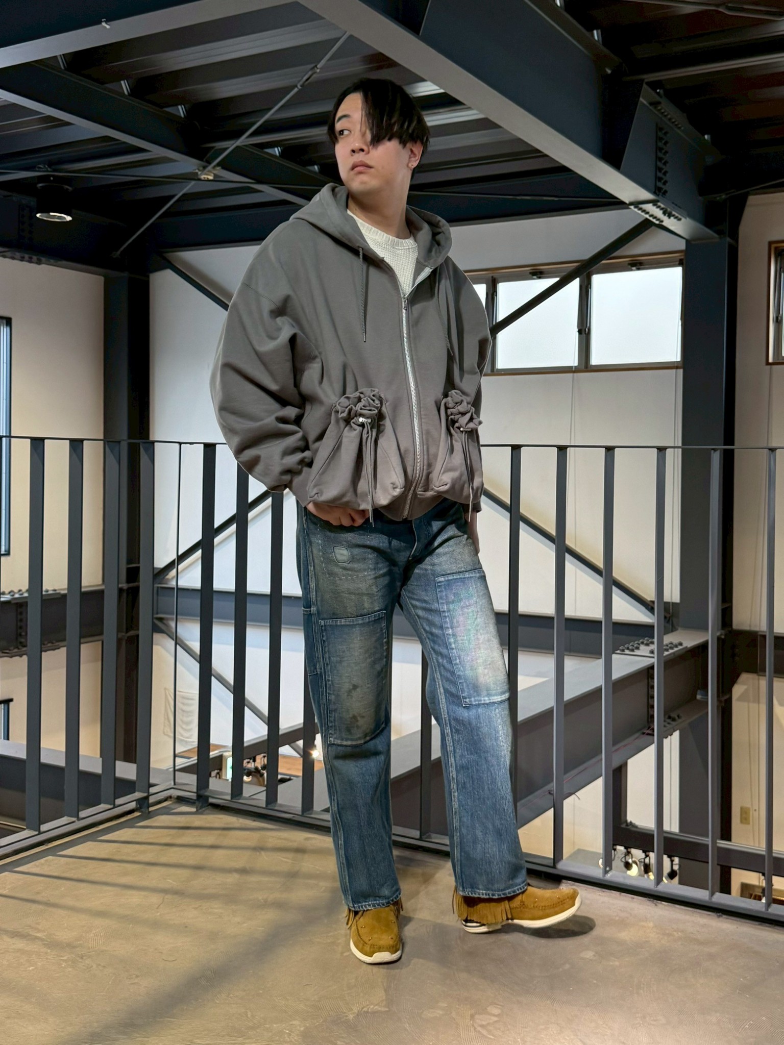 畦編みサーマルとの素材感の対比、リペアデニムの無骨さなど、控えめな色合わせでも存在感のあるコーデへ。
