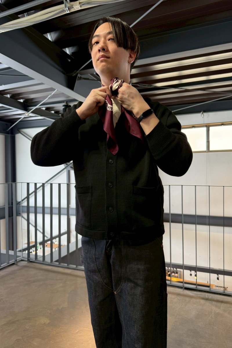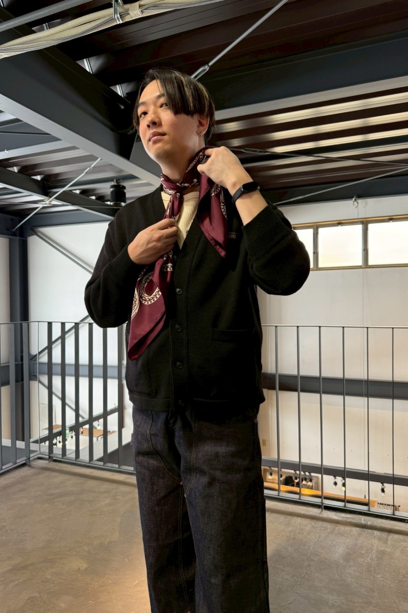 スカーフは首元に軽く巻き、ラフながらも計算された印象に。