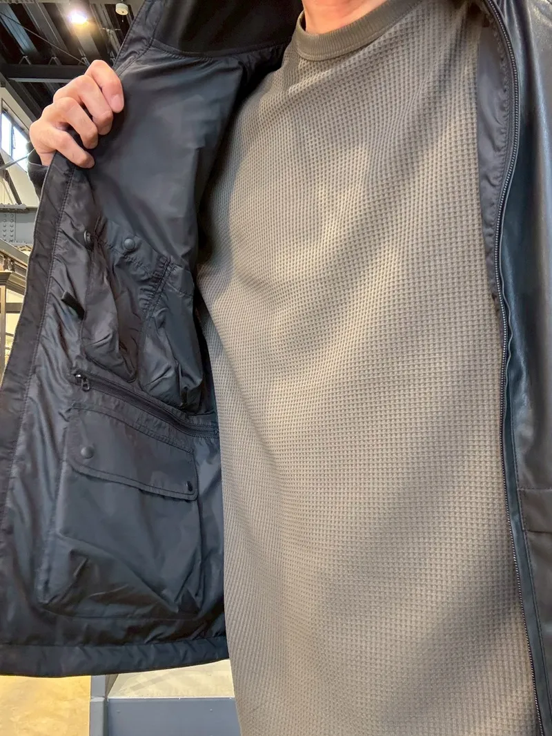 どこか懐かしいウィンドブレーカーのディテールを、モダンなシンセティックレザーでアレンジ。