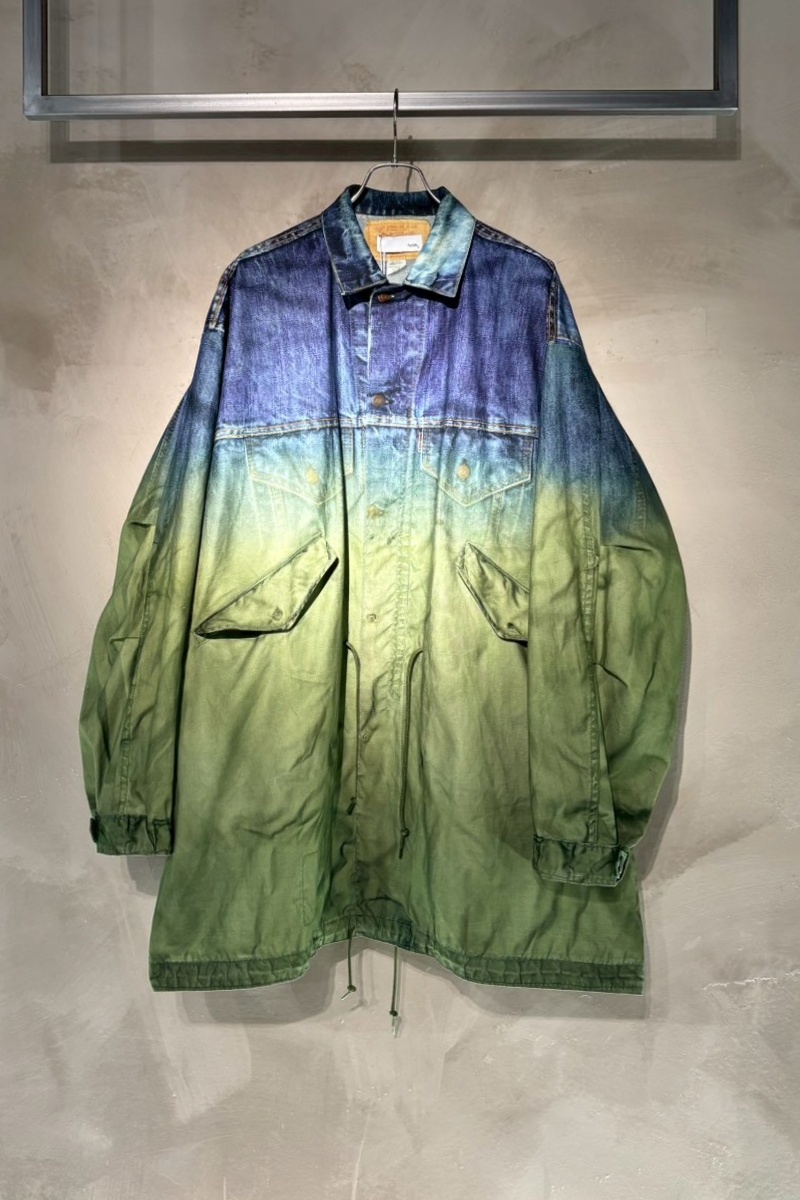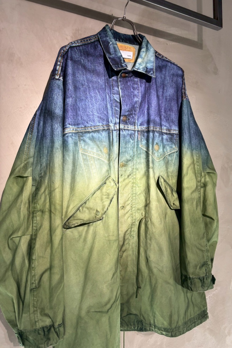 トラッカージャケットとモッズコート、二つの異なるミリタリー・カジュアルの象徴を、まるで合成したかのようなユニークなグラデーションで表現。